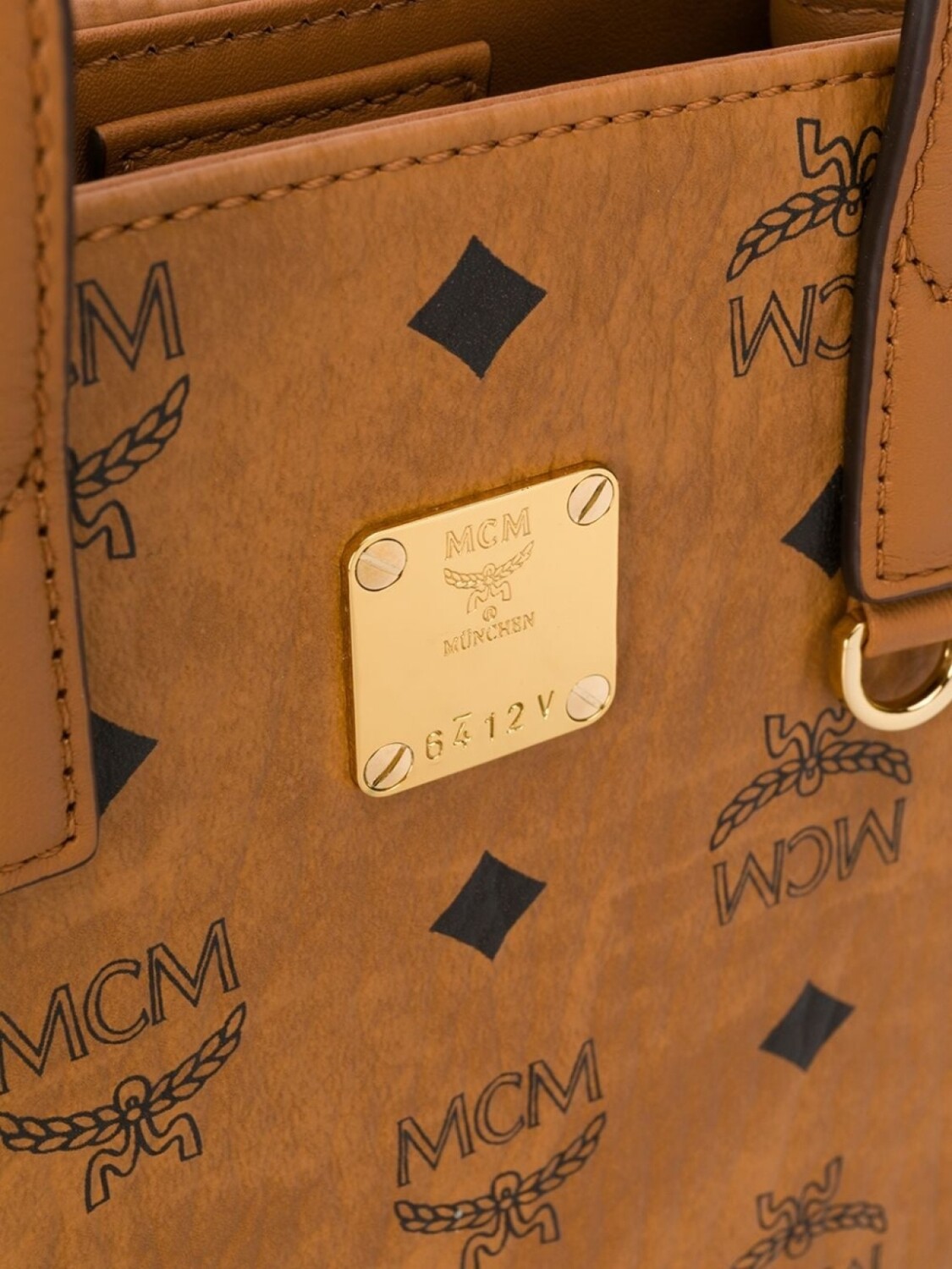 Сумка-тоут с монограммой от MCM. Прямоугольная форма, верхние ручки, регулируемый ремень на плечо, золотистый металлический логотип, застежка на магните сверху и главный внутренний отдел.