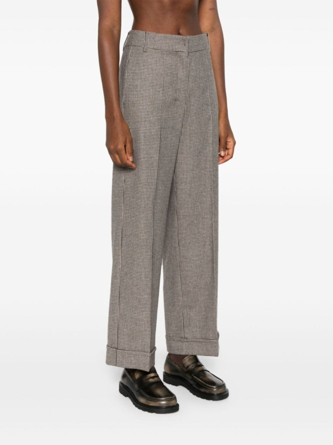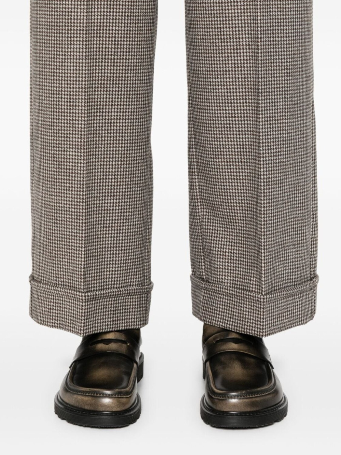 Бежевый/коричневый/черный, смесь натуральной шерсти и кашемира, узор «собачья лапка», заутюженная складка, высокая талия, потайная застежка на пуговицы, крючок и молнию спереди, два врезных кармана по бокам, прямые штанины, отворот, приталенный крой