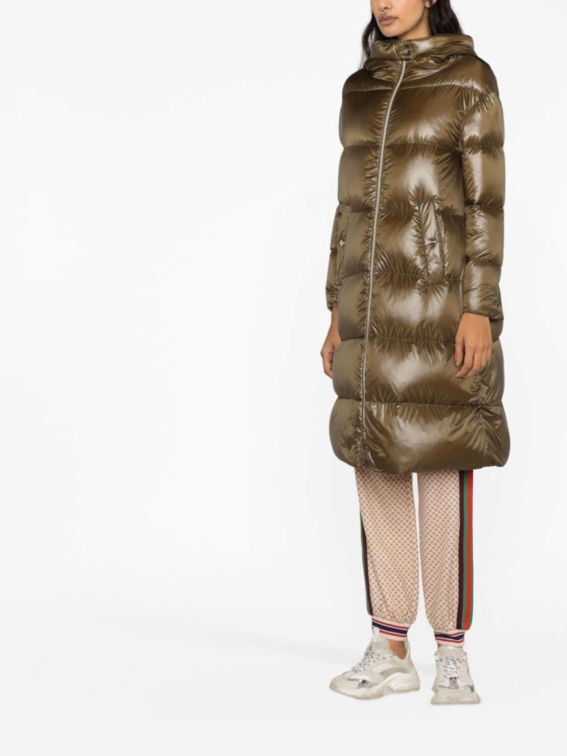 Оливковый, наполнитель из пуха и перьев, дутый материал, стеганая модель, застежка на молнии спереди, классический капюшон и два кармана с клапанами по бокам.