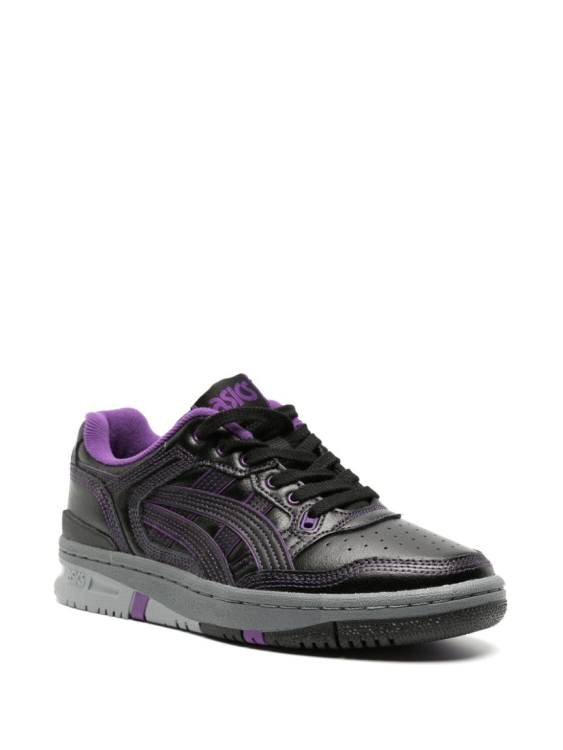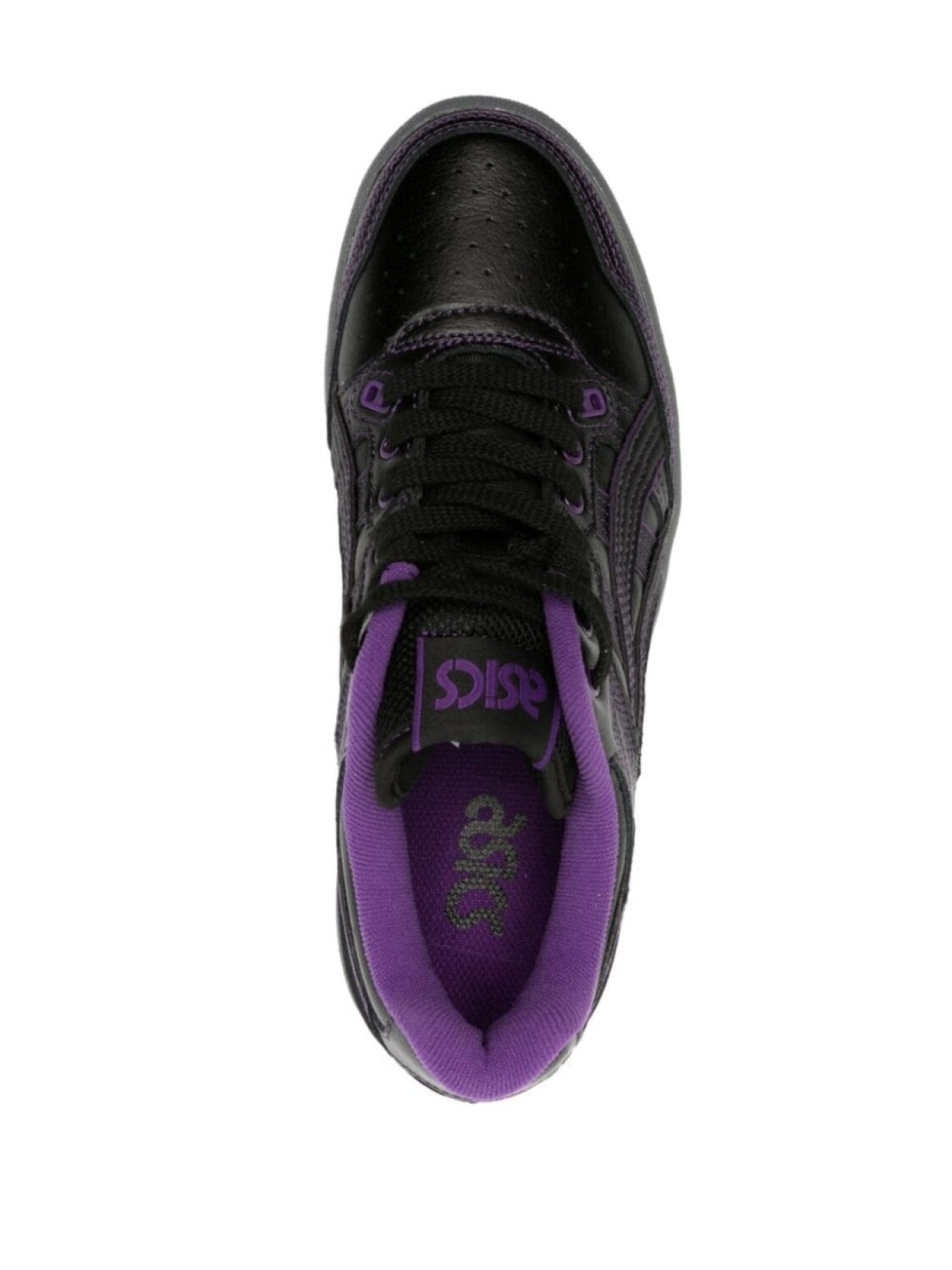 Черный, фиолетовый, телячья кожа, контрастная строчка, перфорация, нашивка с логотипом на язычке, вышитый логотип сзади, закругленный носок, шнуровка спереди, стелька с логотипом и резиновая подошва.
