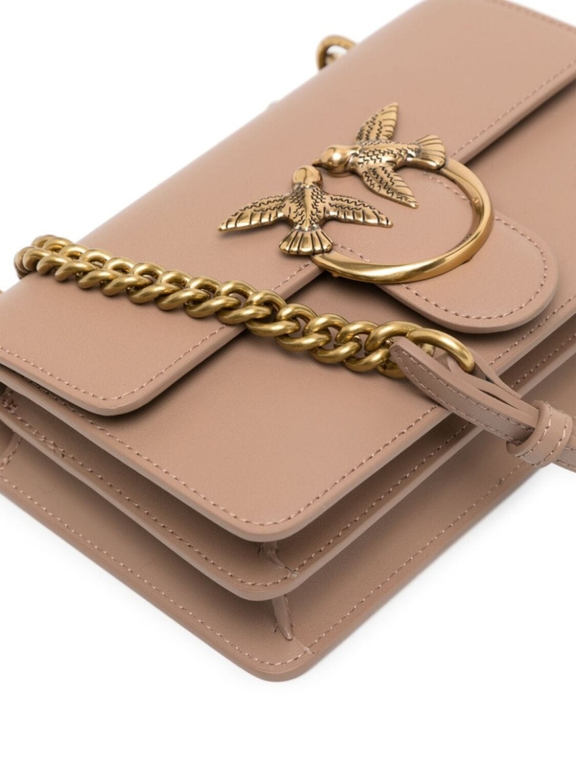 Расцветка Blush Beige, гладкая текстура кожи, пряжка Love Birds, золотистая фурнитура, ремень-цепочка на плечо, откидной клапан на магните, несколько отделений и карман на молнии.