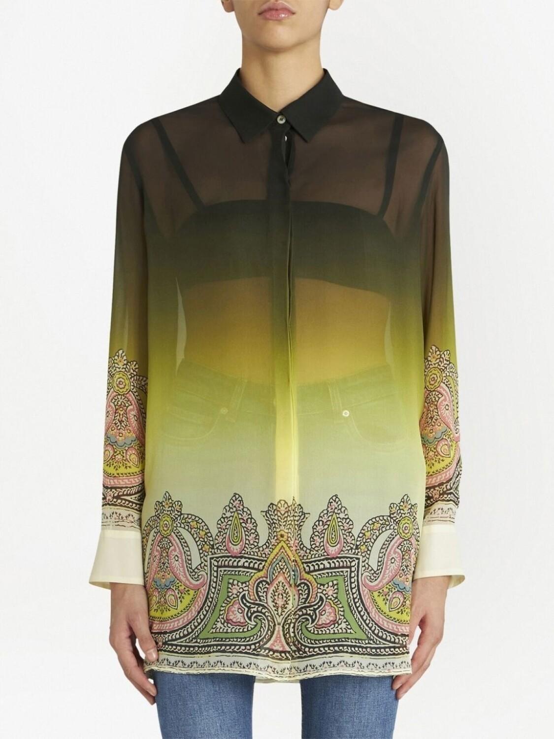 Разноцветный, шелк, градиентный эффект, принт пейсли, классический воротник, потайная пуговичная застежка спереди, длинные рукава, манжеты на пуговицах и прямой подол.