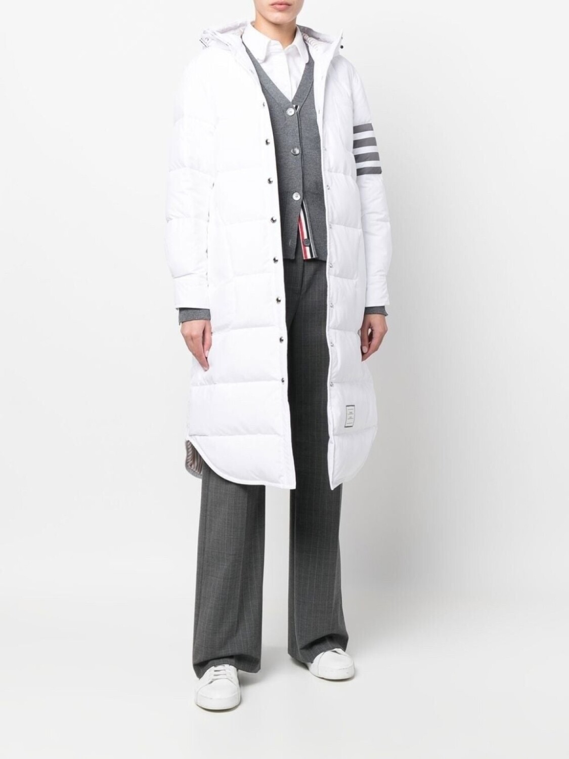 Белый, наполнитель из пуха и перьев, дутый материал, полоски 4-Bar, затягивающийся на шнурок капюшон, длинные рукава, два прорезных кармана по бокам, застежка на кнопках спереди и закругленный подол.