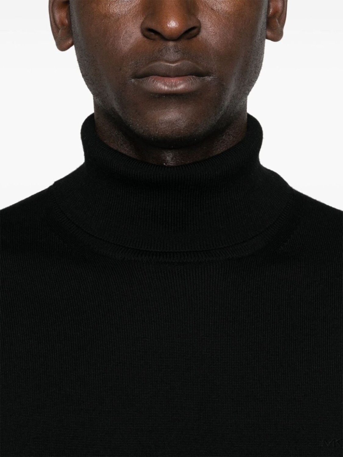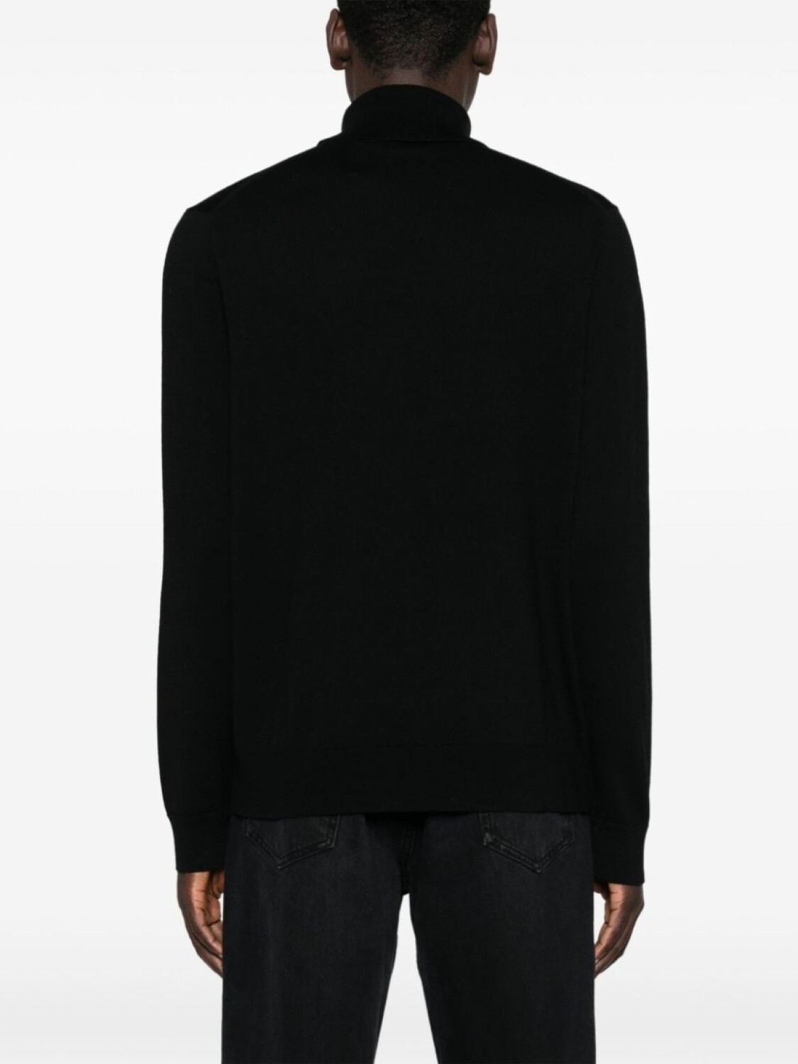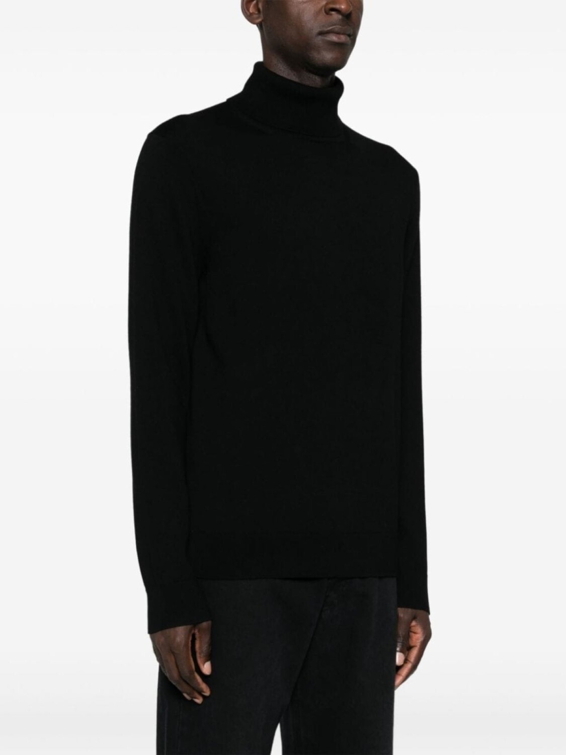 Черный, шерсть мериноса, тонкая вязка, высокий воротник, длинные рукава, вышитый логотип на груди, отделка в рубчик, прямой подол