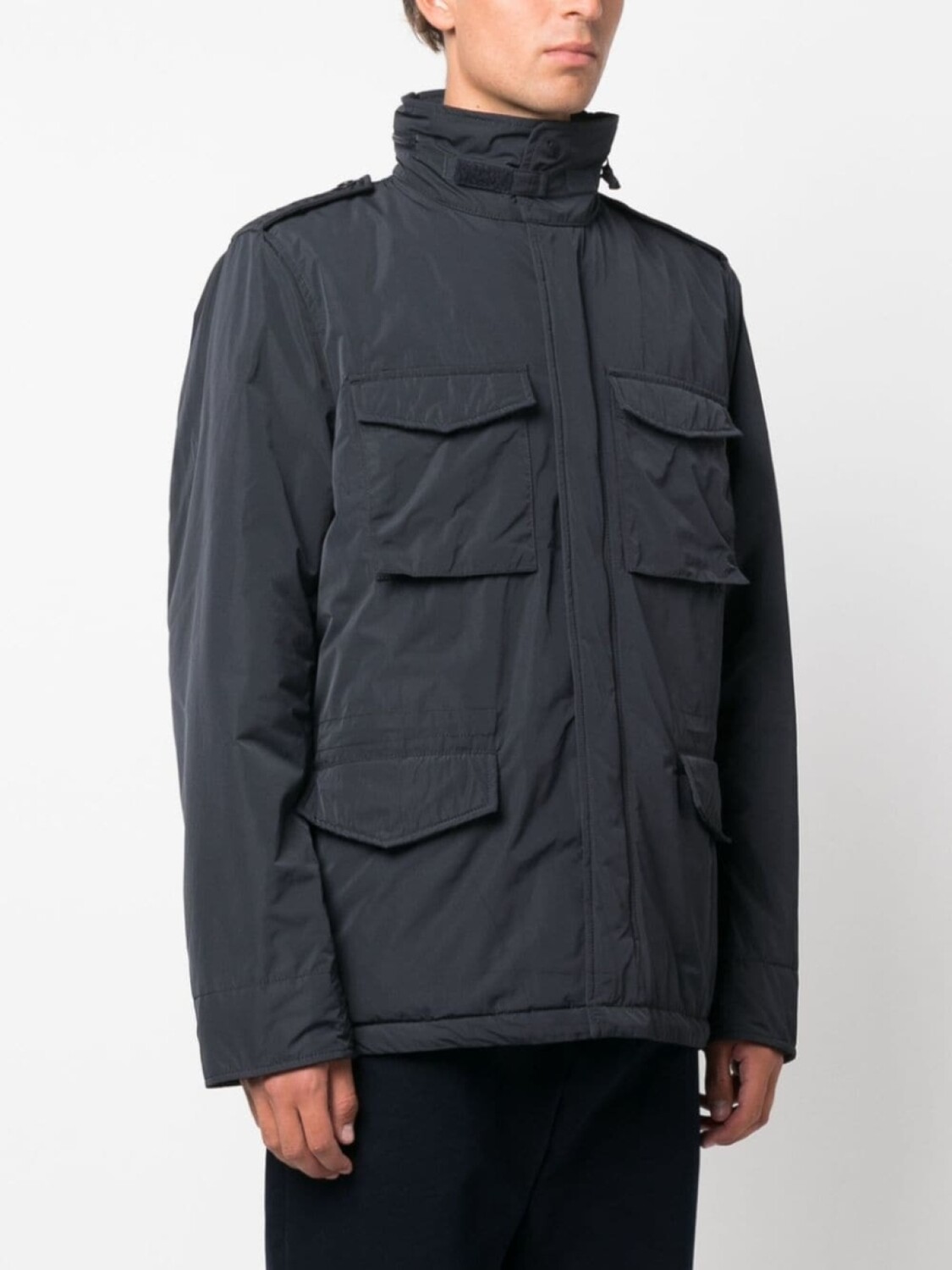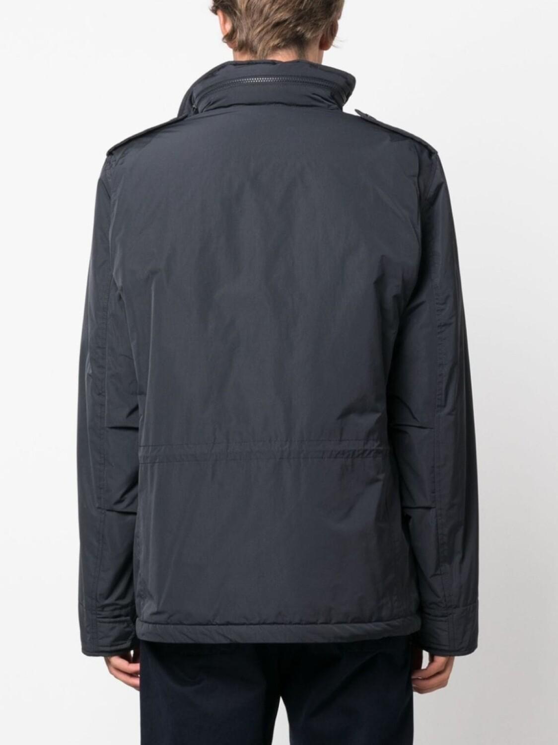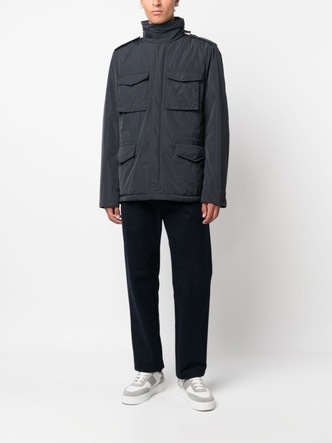 Темно-синий, классический капюшон, высокий воротник, потайная застежка спереди, длинные рукава, два нагрудных кармана с клапанами, два передних кармана с клапанами и прямой подол.