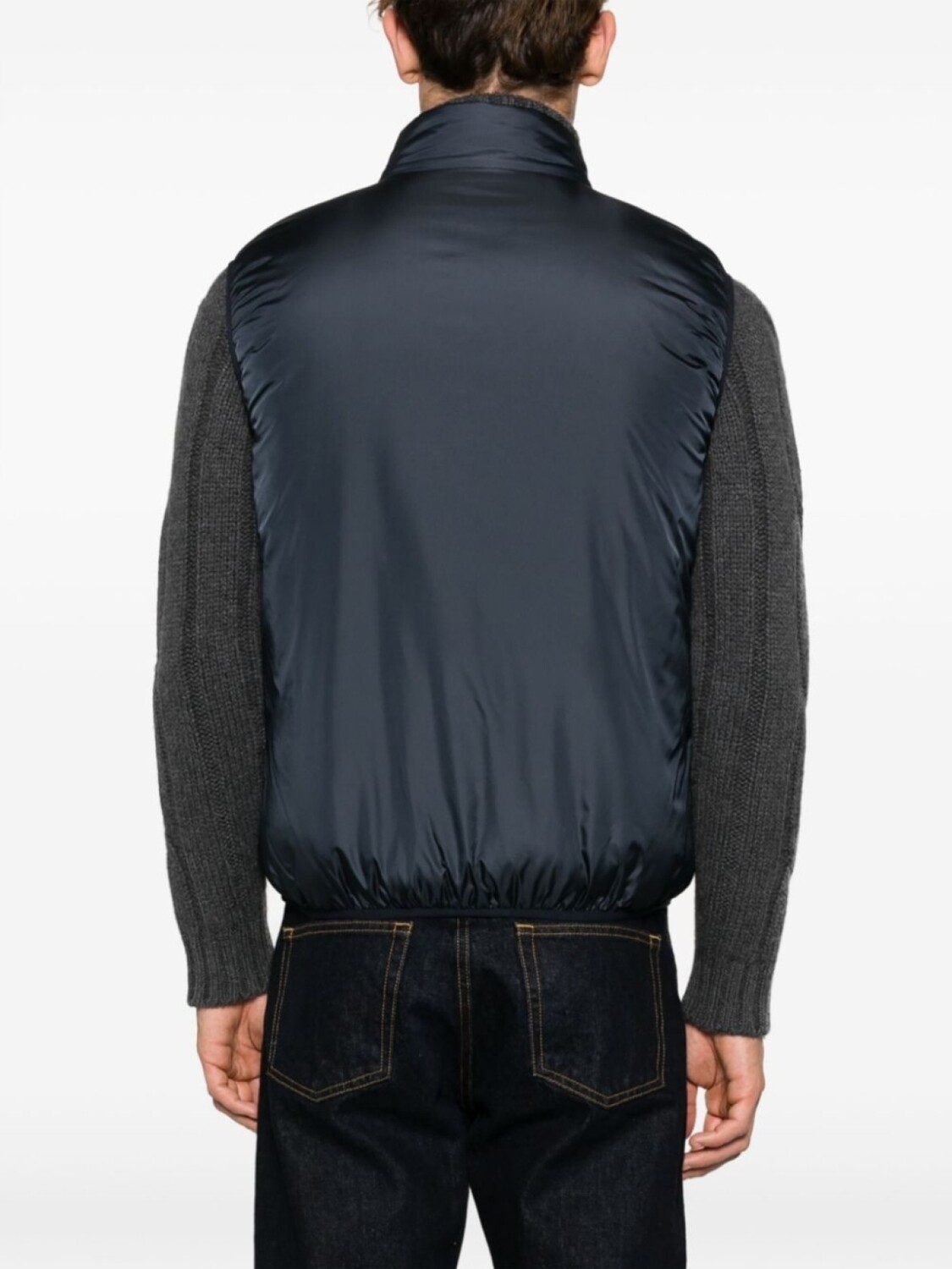 Темно-синий, дутый материал, высокий воротник, двусторонняя молния спереди, без рукавов, два нагрудных кармана на молнии, два прорезных кармана по бокам, эластичный подол и прямой подол.