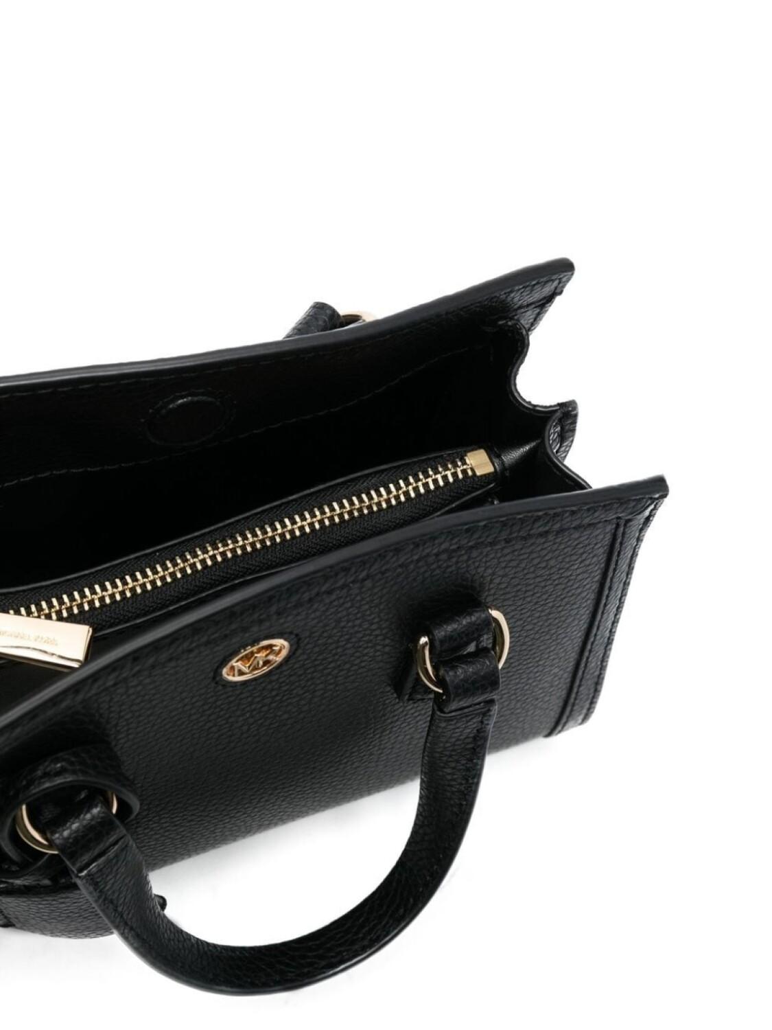 Черный, телячья кожа, золотистый металлический логотип, две длинные верхние ручки, застежка на молнии сверху, основное отделение и съемный регулируемый ремень на плечо.