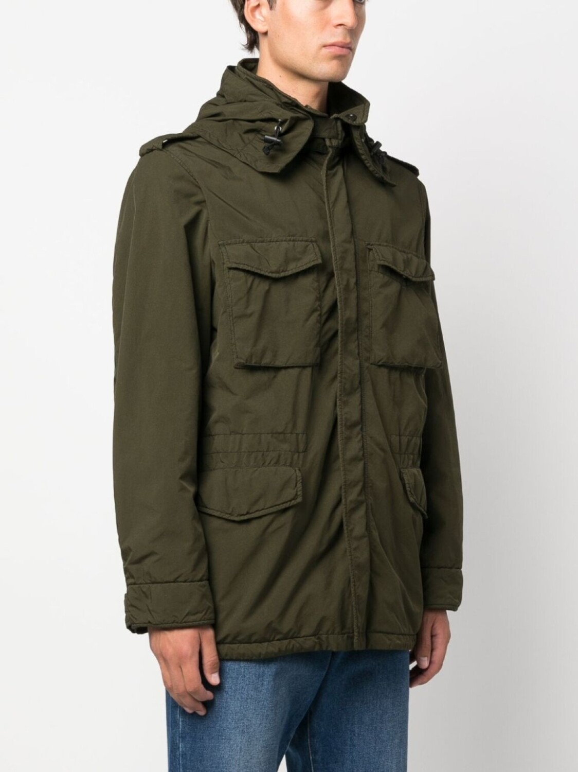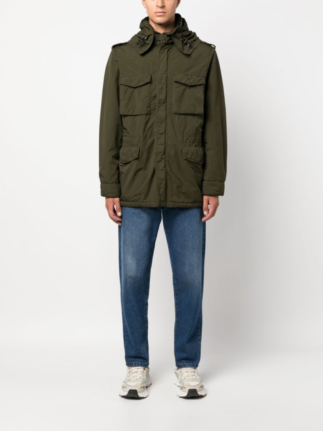 Оливково-зеленый, застежка на кнопки и молнию спереди, эполеты, длинные рукава, манжеты с застежкой на кнопки, четыре передних кармана с клапанами, внутренний карман на молнии, внутренние накладные карманы и подол с кулиской.