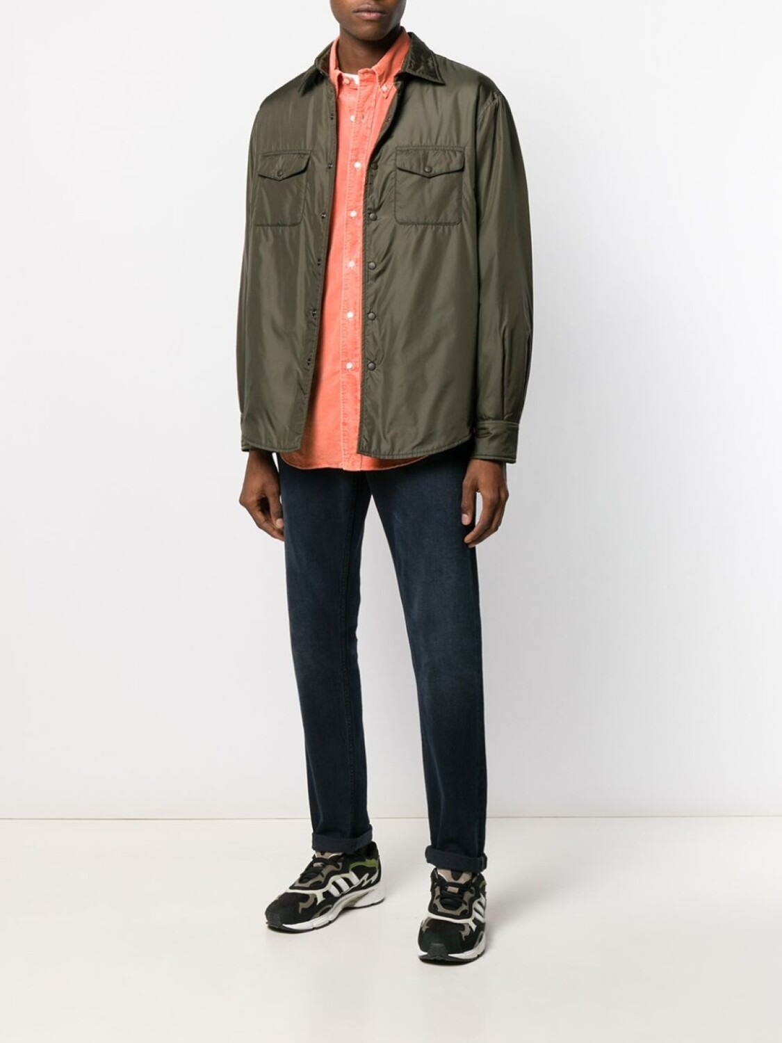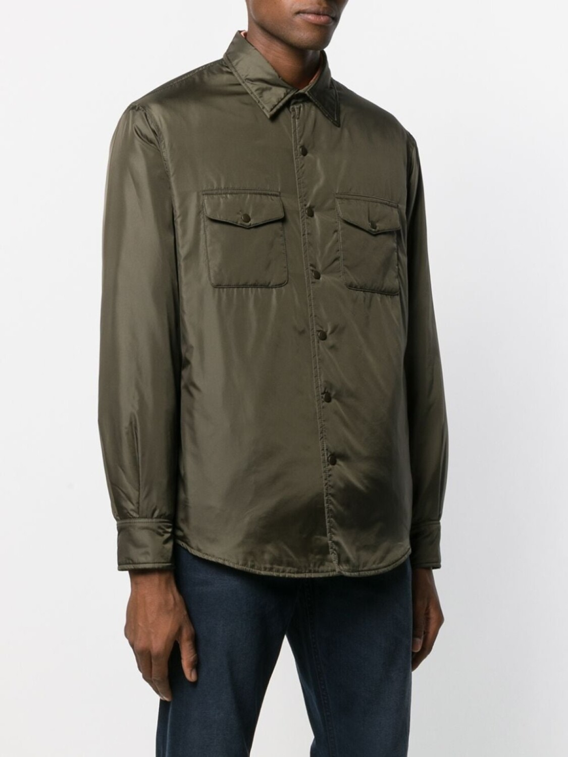 Классический воротник, застежка на кнопки, нагрудные карманы с клапаном, длинные рукава и рукава с манжетами.