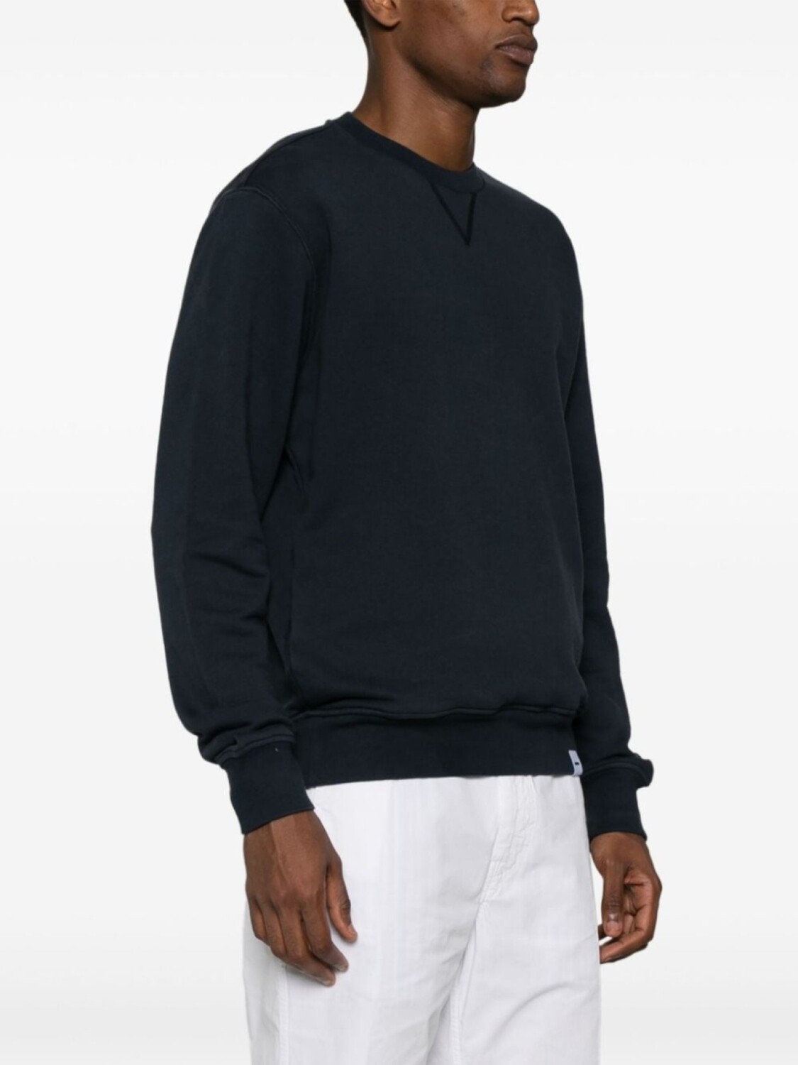 Темно-синий, хлопок, ткань джерси, бирка с логотипом, отделка в рубчик, круглый вырез, длинные рукава, два прорезных кармана по бокам, прямой подол