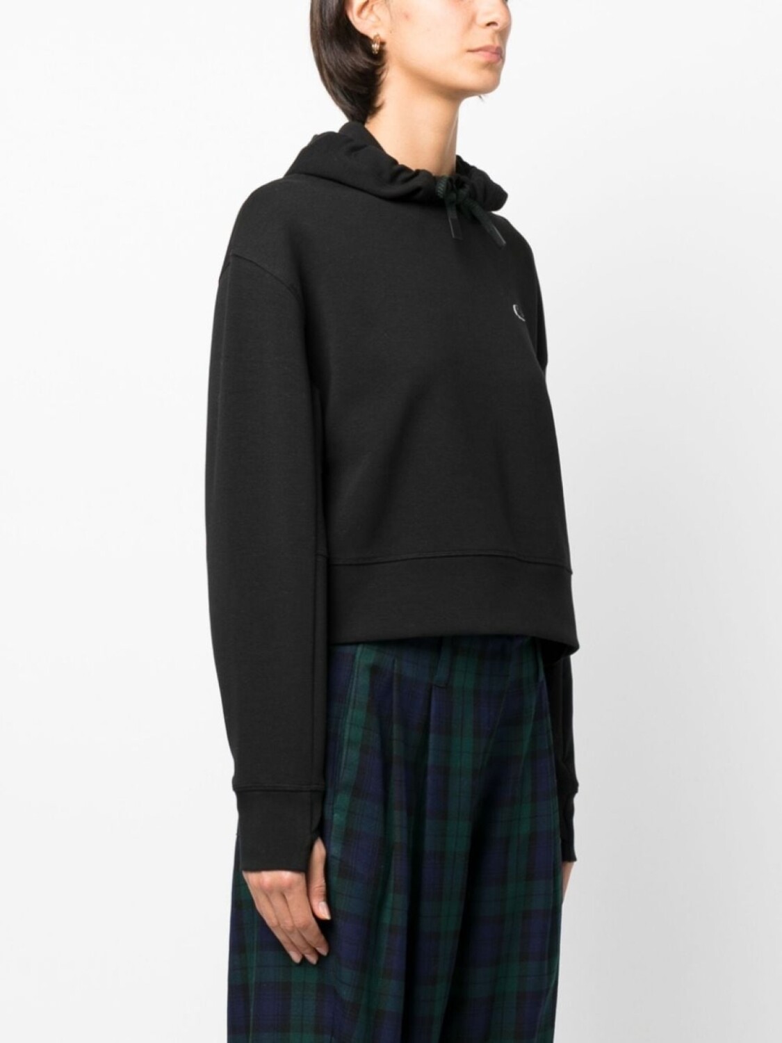 Черный, смесовый хлопок, вышитый логотип на груди, нашивка с логотипом на рукаве, принт с логотипом сзади, застежка на молнии сбоку, приспущенные плечи, длинные рукава, вырезы для больших пальцев, затягивающийся на шнурок капюшон и карман с молнией на рукаве.