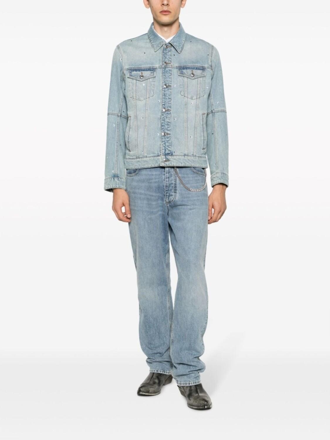 Голубой, хлопок, обработанный деним, декор из кристаллов, отложной воротник, застежка на пуговицах спереди, длинные рукава, манжеты на пуговицах, нагрудный карман на двух пуговицах, два прорезных кармана сбоку и прямой подол. Это унисекс-модель. Обратите внимание, что для нее используется мужская размерная сетка.
