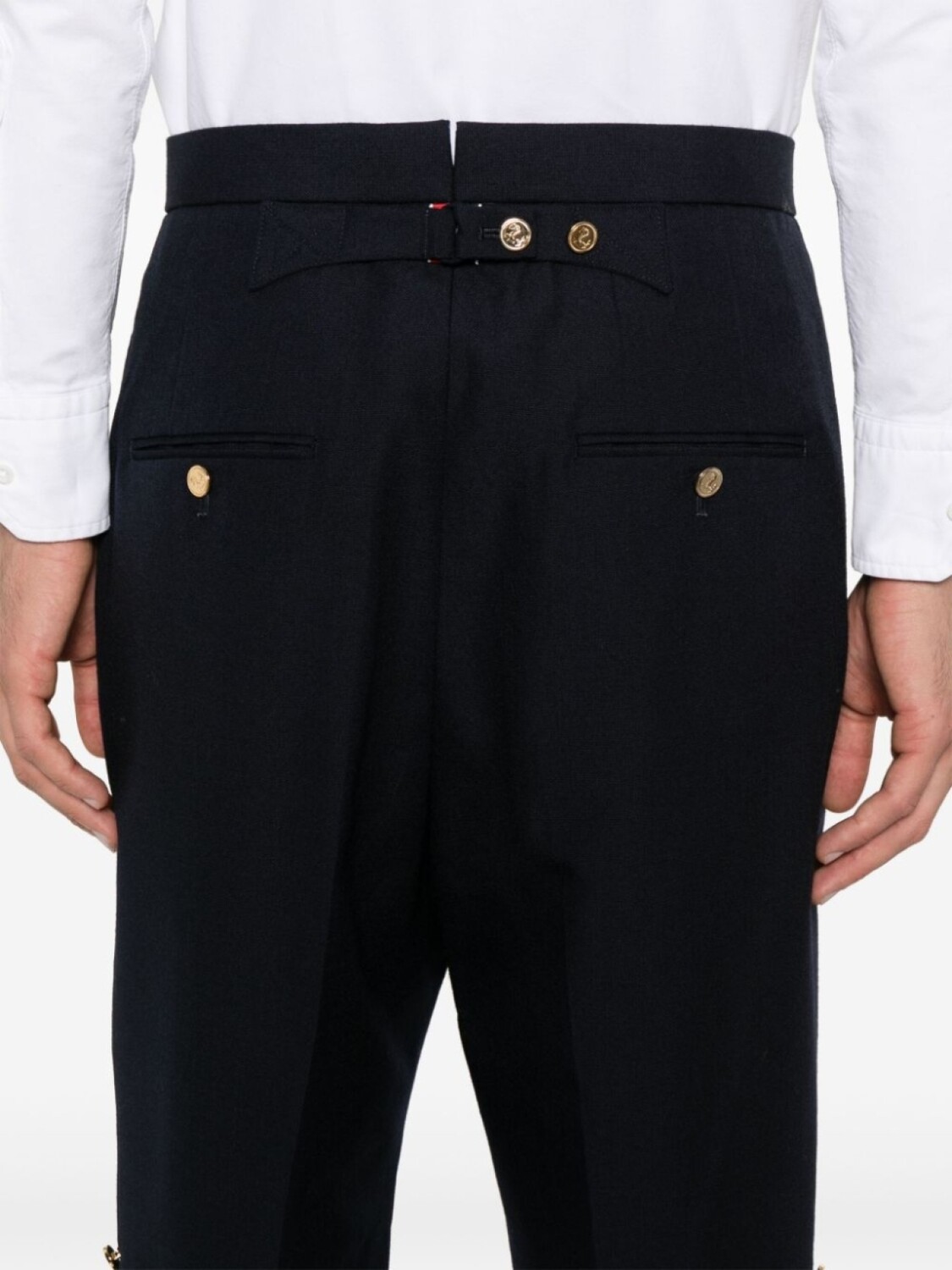 Подробнее о товаре: • темно-синий • вирджинская шерсть • канвас • стрелки • два прорезных кармана по бокам • два прорезных кармана на пуговицах сзади • регулируемый ремешок сзади • петля с декором RWB • разрезы по бокам • декоративные пуговицы • подкладка в полоску RWB • золотистые пуговицы с тиснением • потайная застежка на пуговицу и крючок