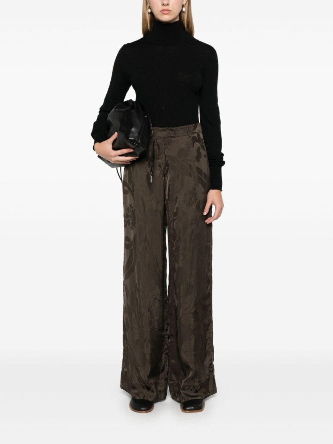 Хаки, жаккардовый цветочный узор, прямой крой, петли для ремня, два вшитых кармана по бокам, два прорезных кармана сзади, застежка на пуговицах спереди