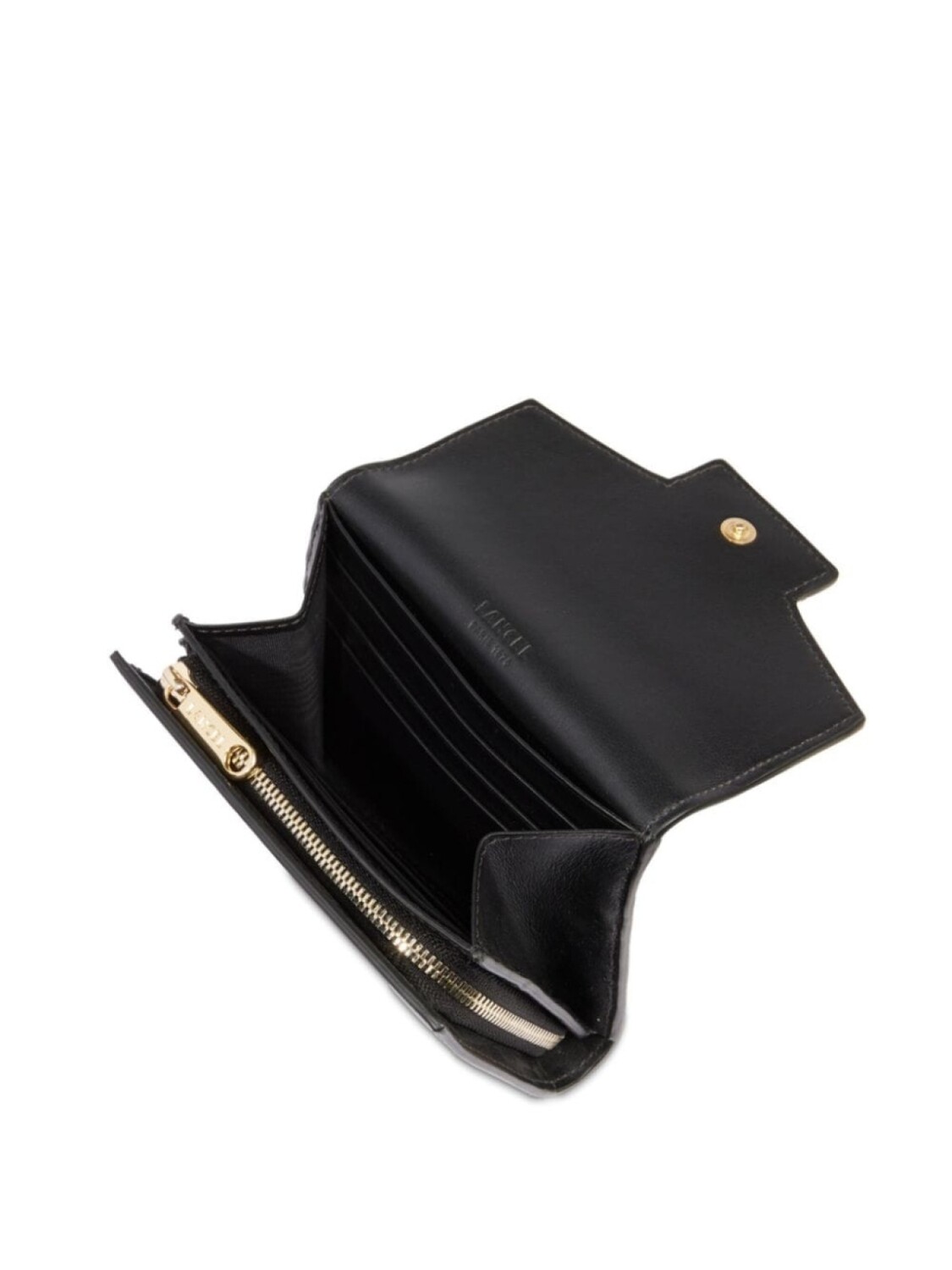 Черный, телячья кожа, гладкая текстура кожи, золотистый металлический логотип, тисненый логотип спереди, откидной верх на магнитной застежке, основное отделение, внутренний карман на молнии, внутренние отделения для карт, подкладка из хлопка