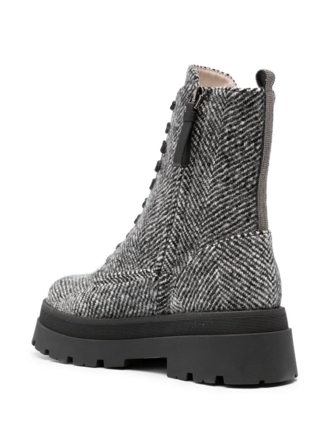 Черный/белый, принт в елочку, петля для подтягивания сзади, украшения из горного хрусталя, закругленный носок, шнуровка спереди, застежка на молнии сбоку, высота по щиколотку и массивная резиновая подошва.