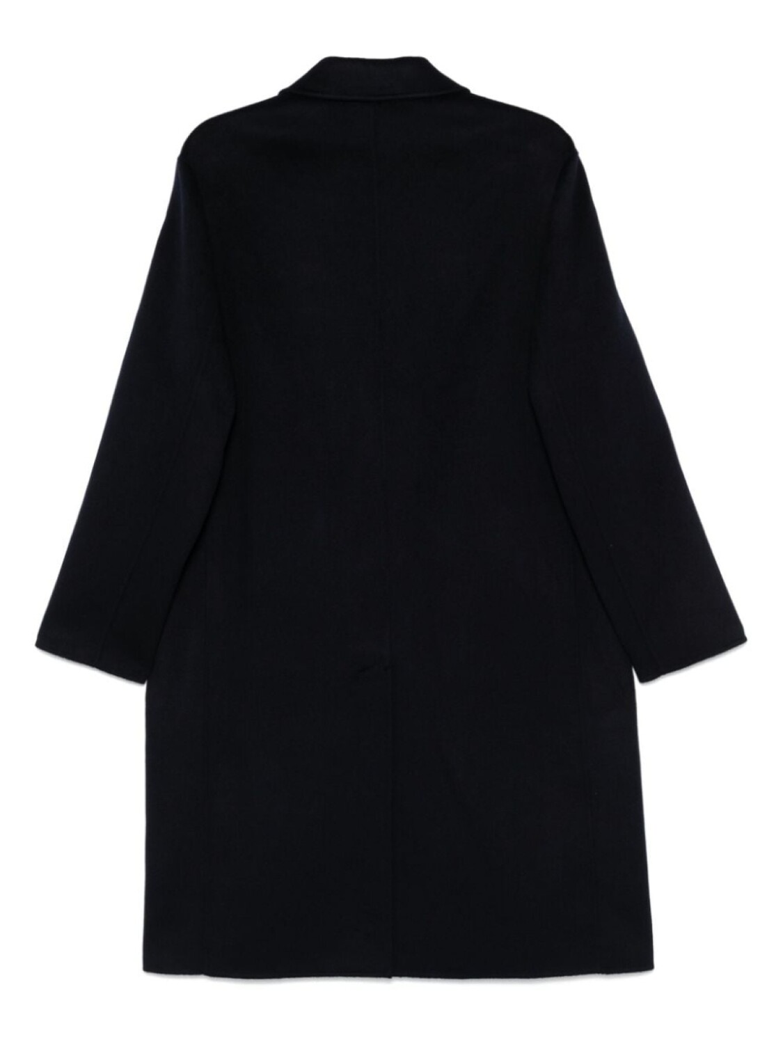 Темно-синяя смесь шерсти, кашемира и шелка, застежка на пуговицы спереди, классический воротник, длинные рукава, два прорезных кармана по бокам, американская шлица сзади, без подкладки, прямой подол, длинная