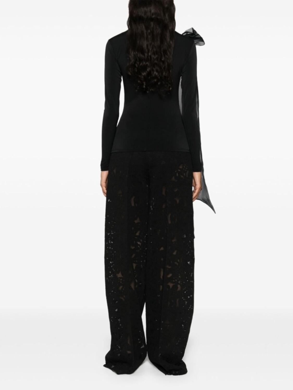 Черный, фактурная отделка, высокий воротник, длинные рукава, детали с оборками, драпировка, прямой подол, потайная застежка на молнии сзади