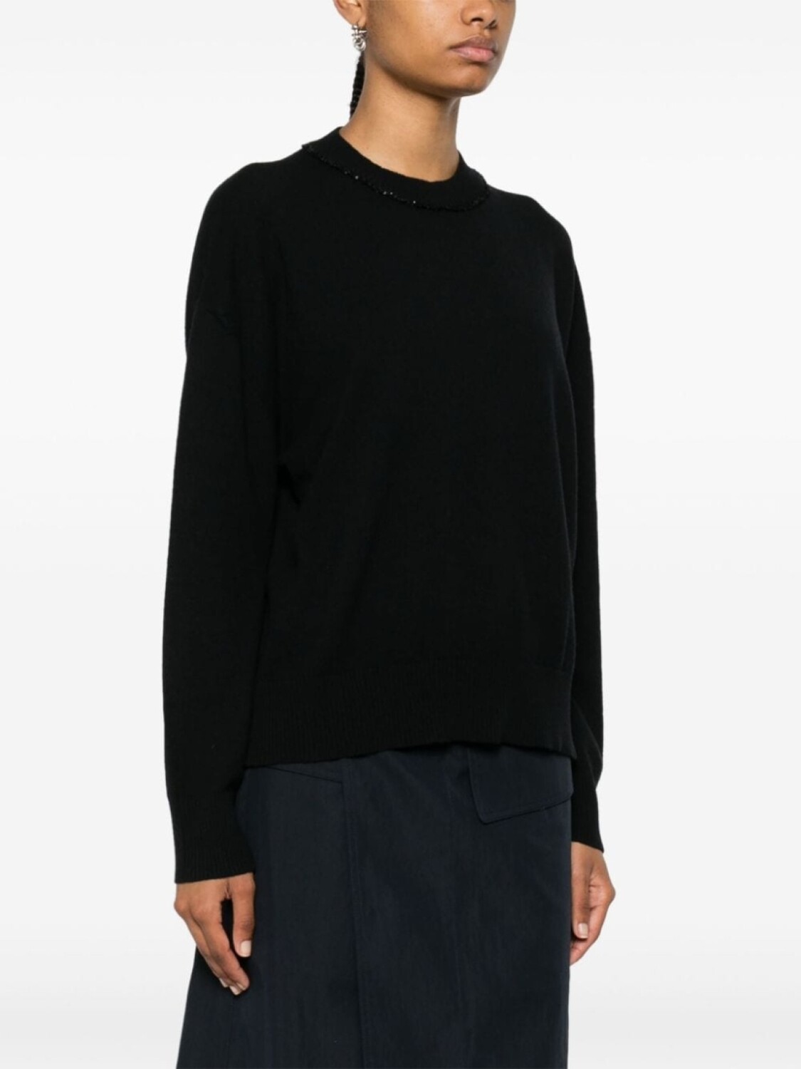 Черный, смесь необработанной шерсти и шелка, вязаный дизайн, круглый вырез в рубчик с пайетками, длинные рукава, подол и манжеты в рубчик