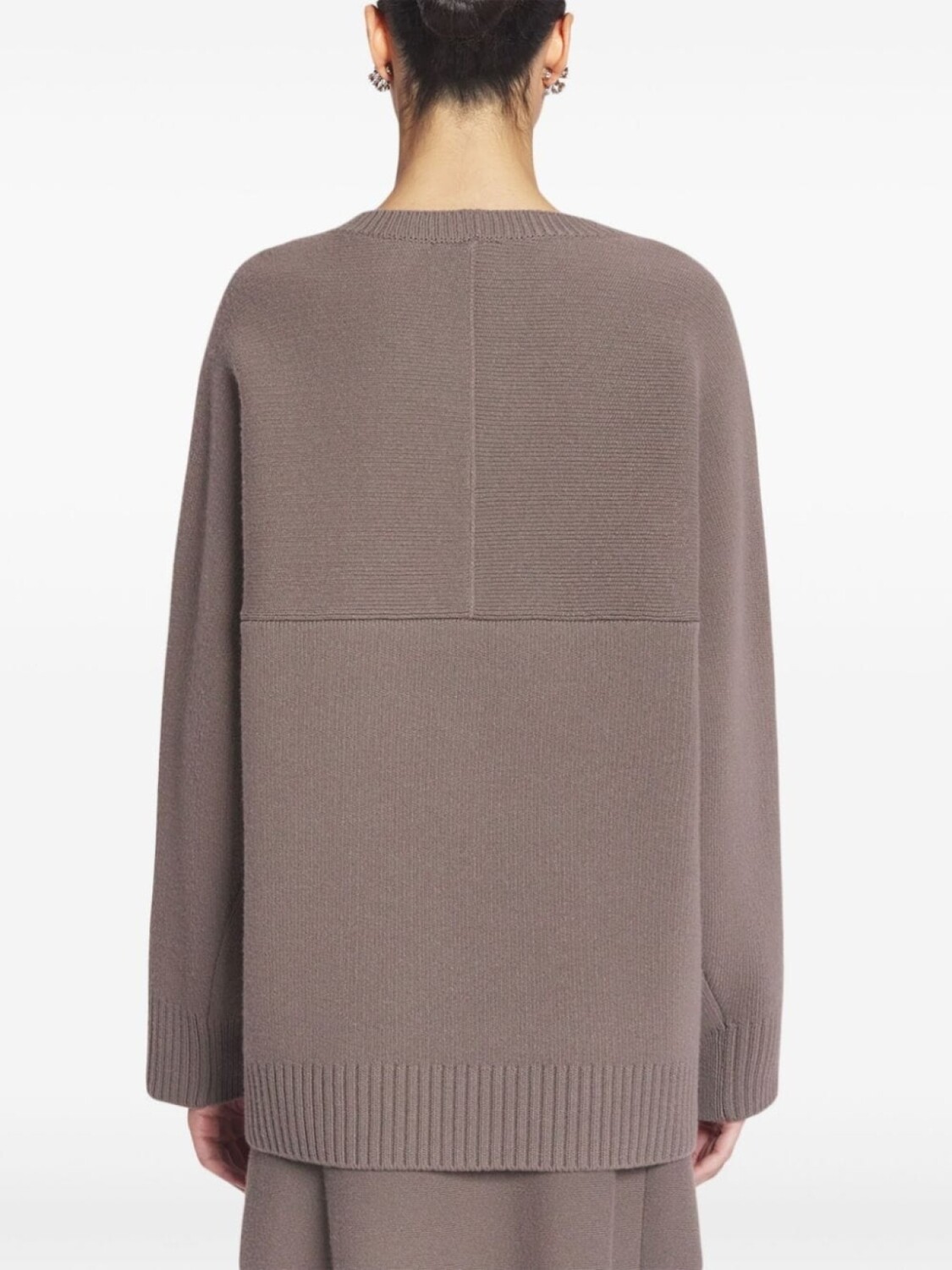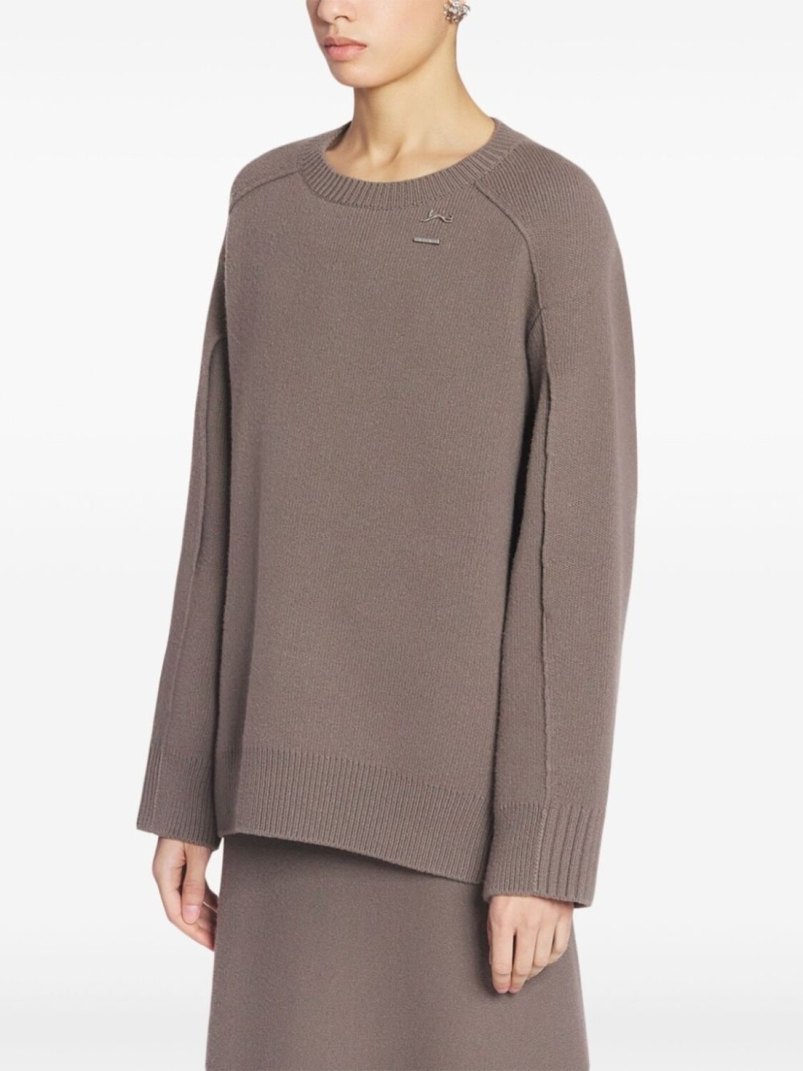 Коричневая шерсть с добавлением кашемира, свободная оправа, серебристая бляшка с логотипом, круглый вырез, длинные рукава с разрезами, ребристые манжеты и подол