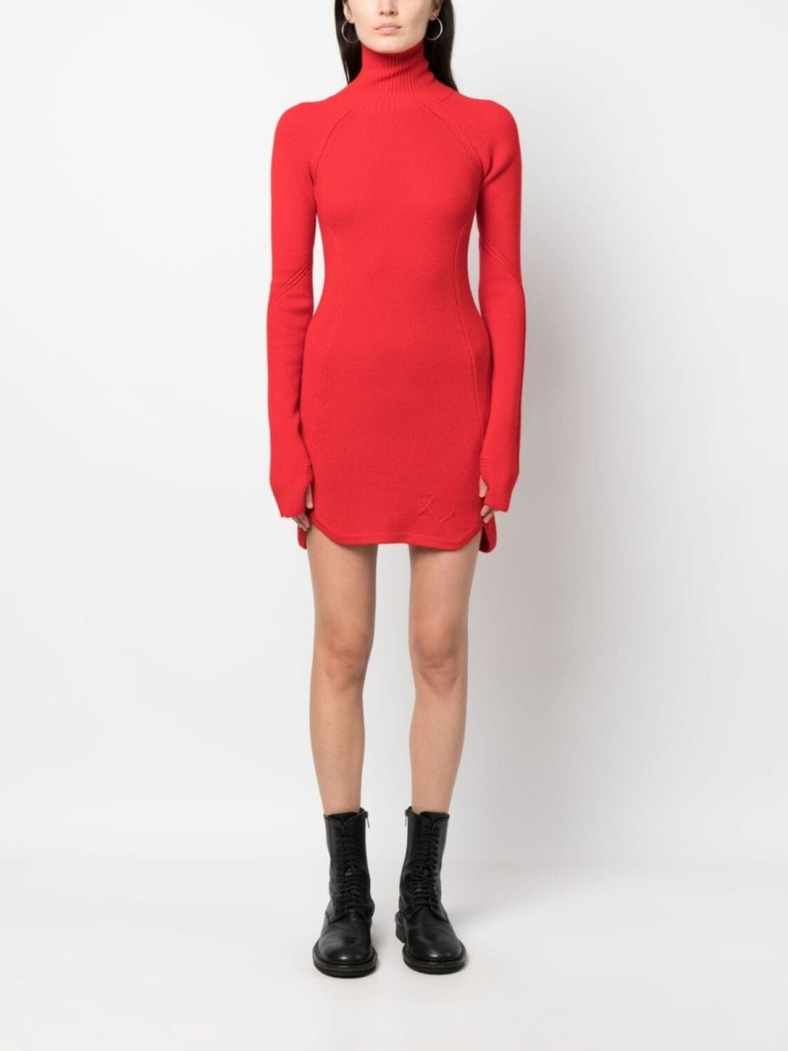Ярко-красный, шерсть, трикотажный материал, тисненый логотип спереди, без задника, высокий воротник, длинные рукава, длина до бедер и закругленный подол.