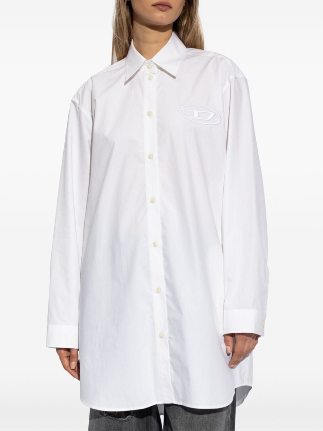 Белый хлопок, свободные рукава, манжеты на пуговицах, вышитый логотип на груди, застежка на пуговицы спереди