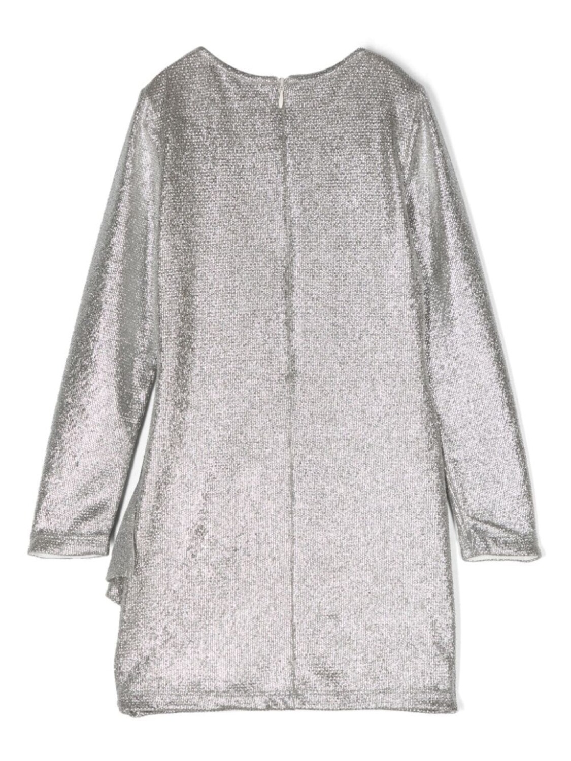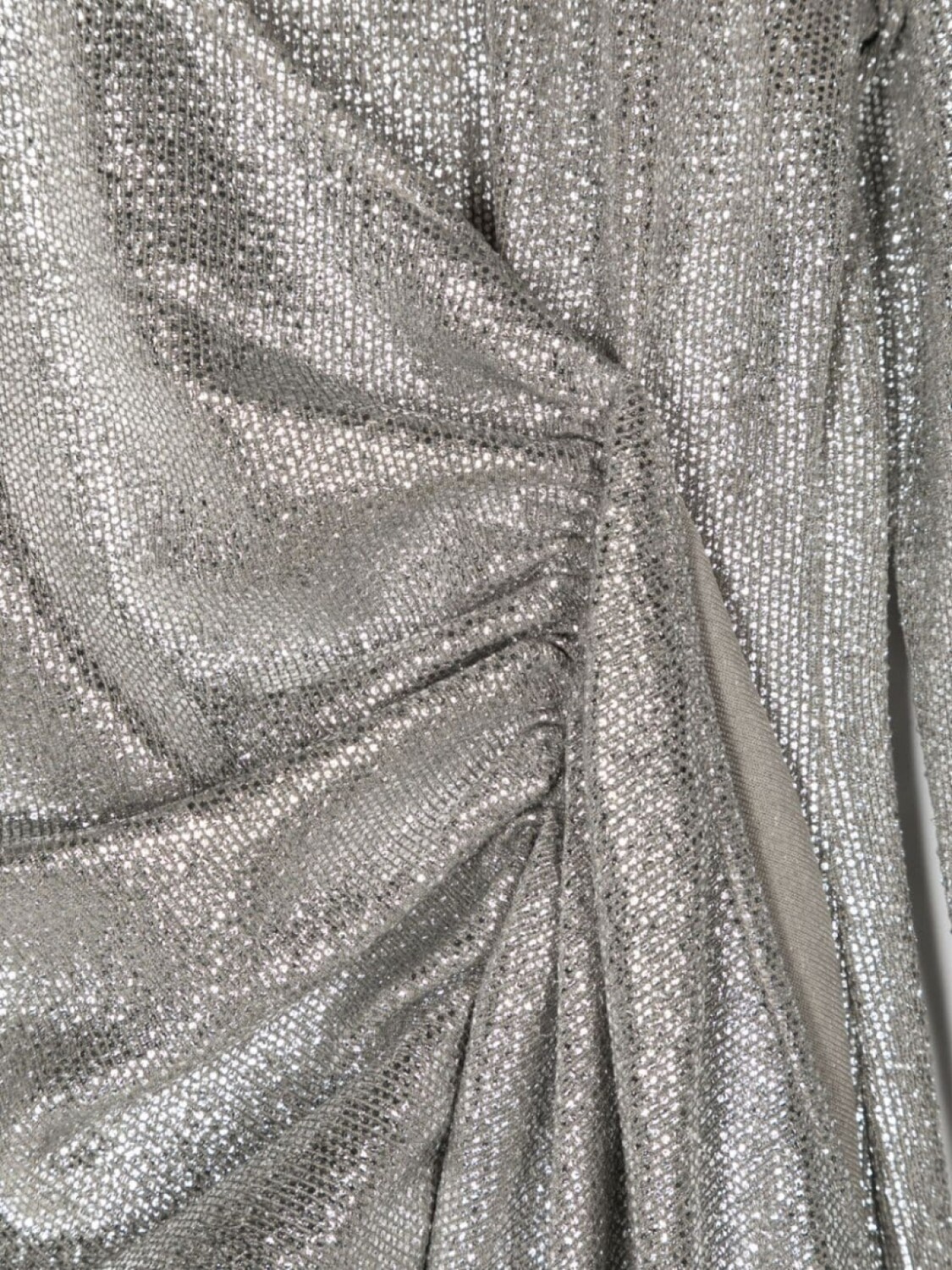 Серебристый металлический эффект, круглый вырез горловины, длинные рукава, драпировка, подкладка, прямой подол, потайная застежка-молния сзади