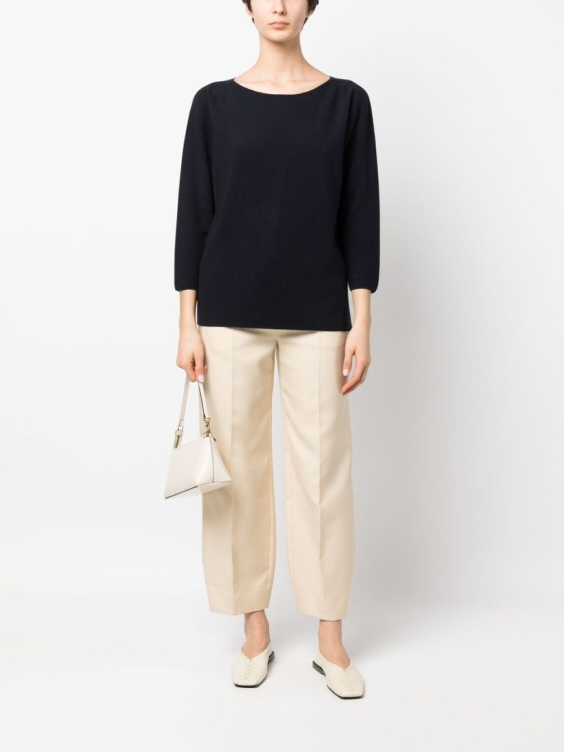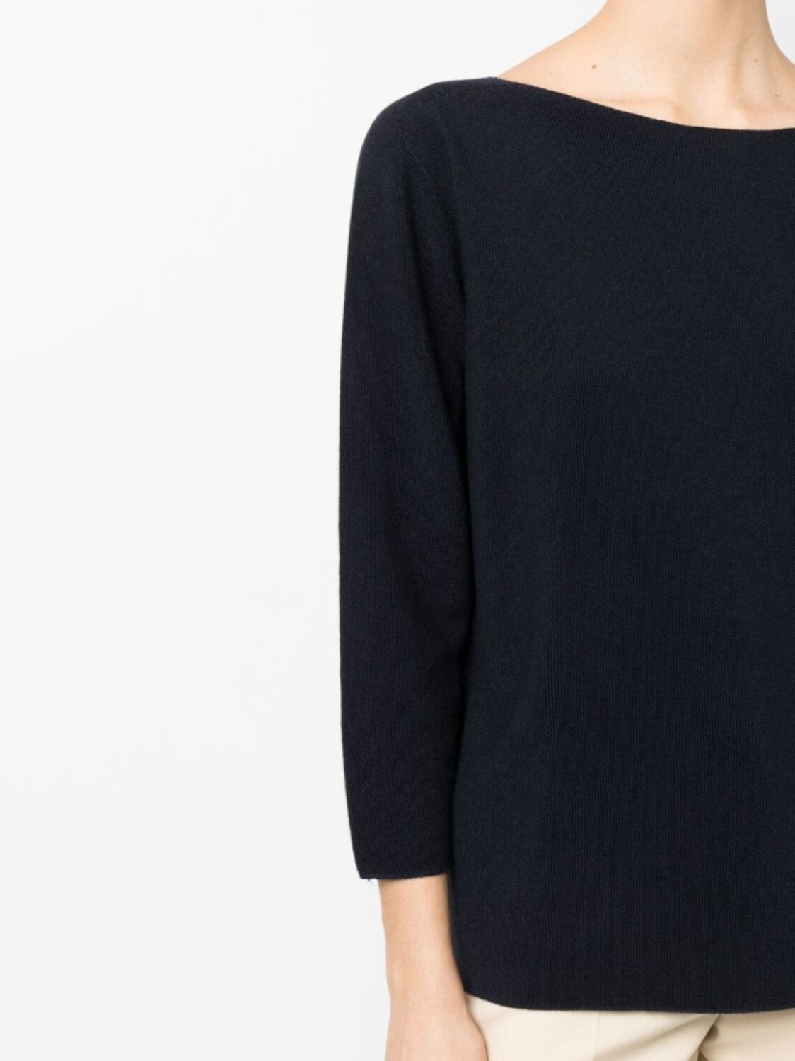 Темно-синий, необработанная шерсть, хлопок, вырез-лодочка, рукава три четверти и прямой подол.
