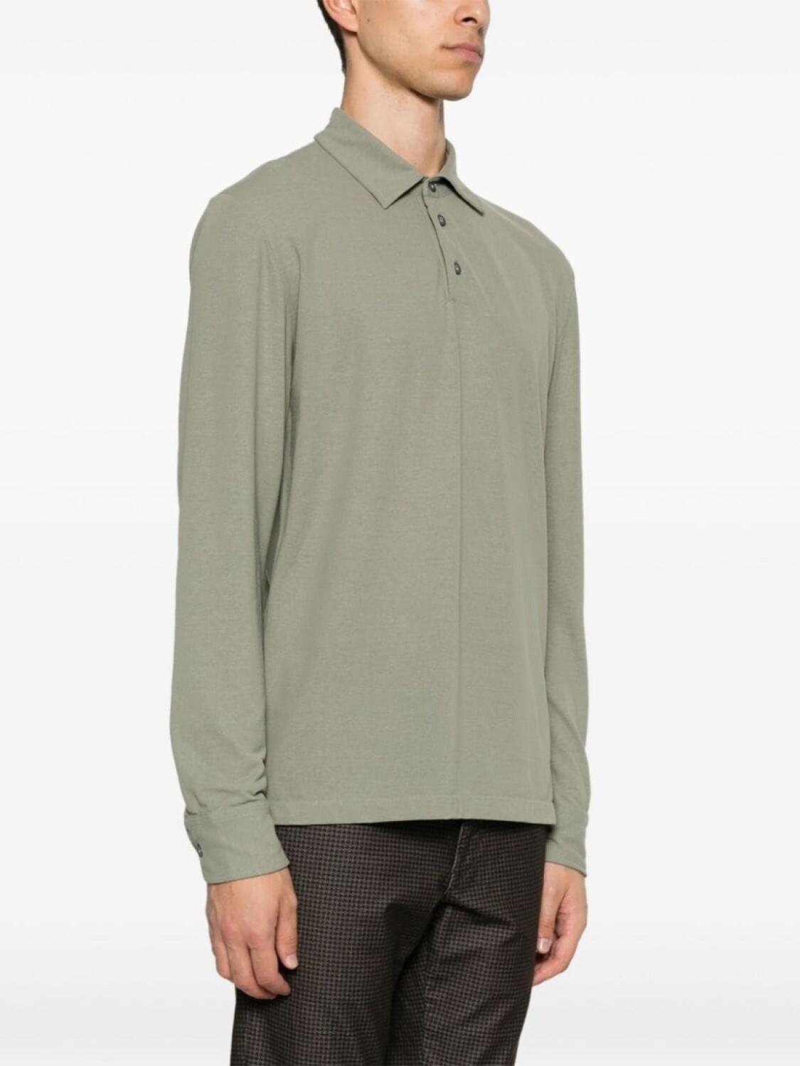Серо-зеленый, хлопок, легкая ткань джерси, воротник поло, длинные рукава, манжеты на пуговицах, прямой подол, короткая застежка на пуговицах спереди
