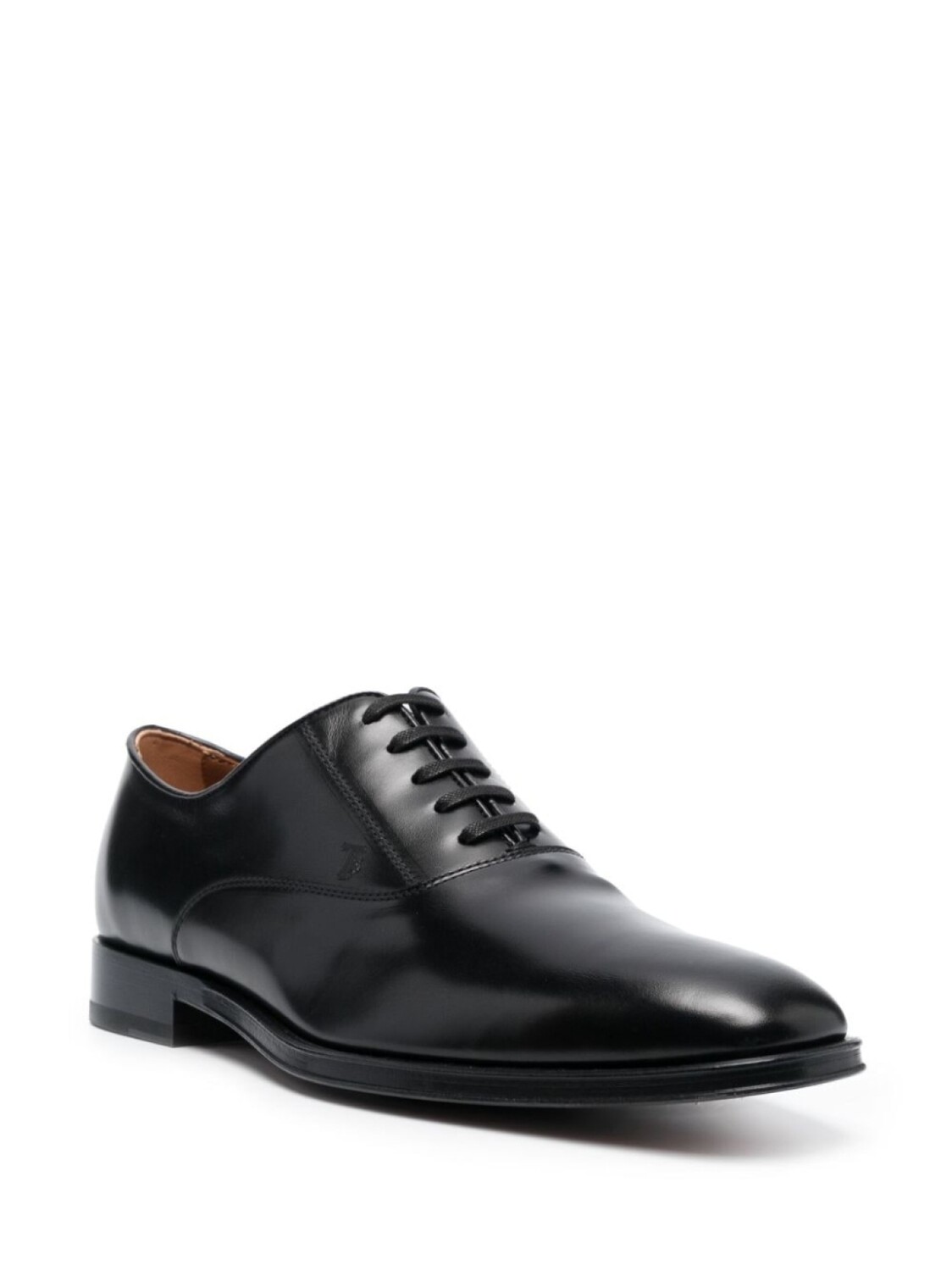 Черный, телячья кожа, строчка в тон, миндалевидный носок, шнуровка спереди, кожаная стелька с логотипом и кожаная подошва.