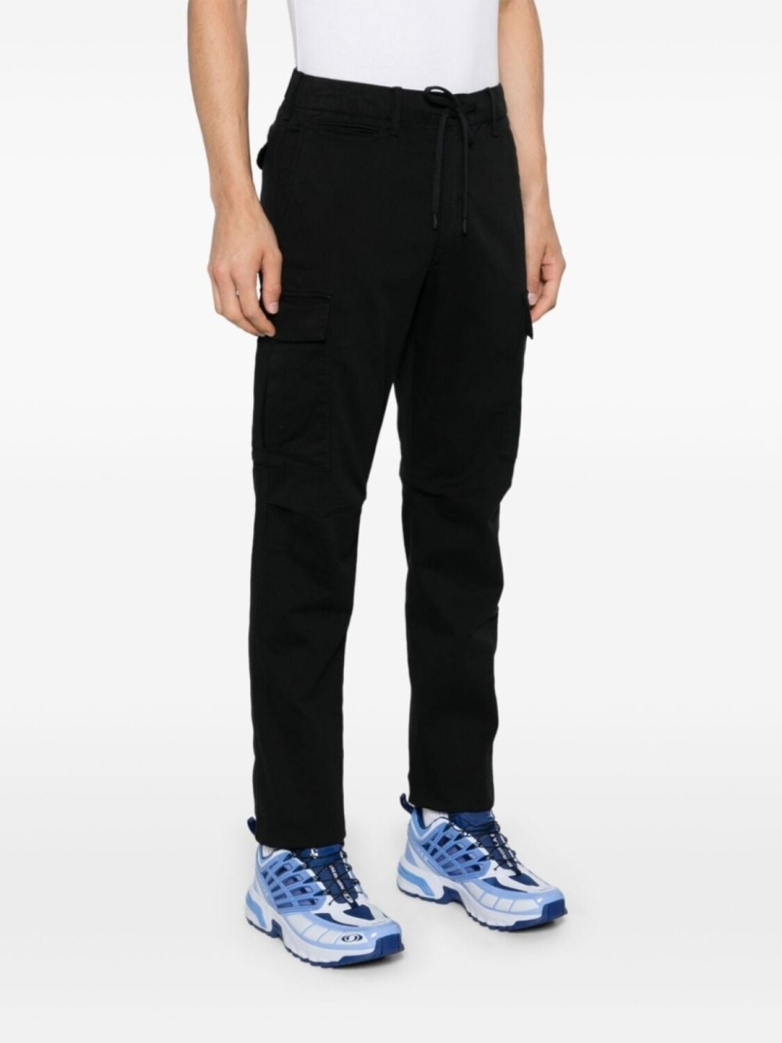 Черный, смесовый хлопок, петли для ремня, застежка на кнопки и молнию спереди, эластичный пояс на шнурке, средняя посадка, прорезной карман спереди, два прорезных кармана по бокам, два накладных кармана по бокам, знаковый логотип Polo Pony, вышитый логотип сзади, два кармана с клапанами сзади, зауженный крой