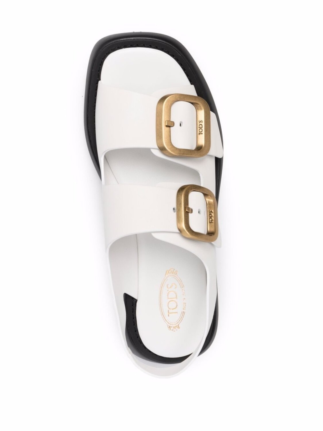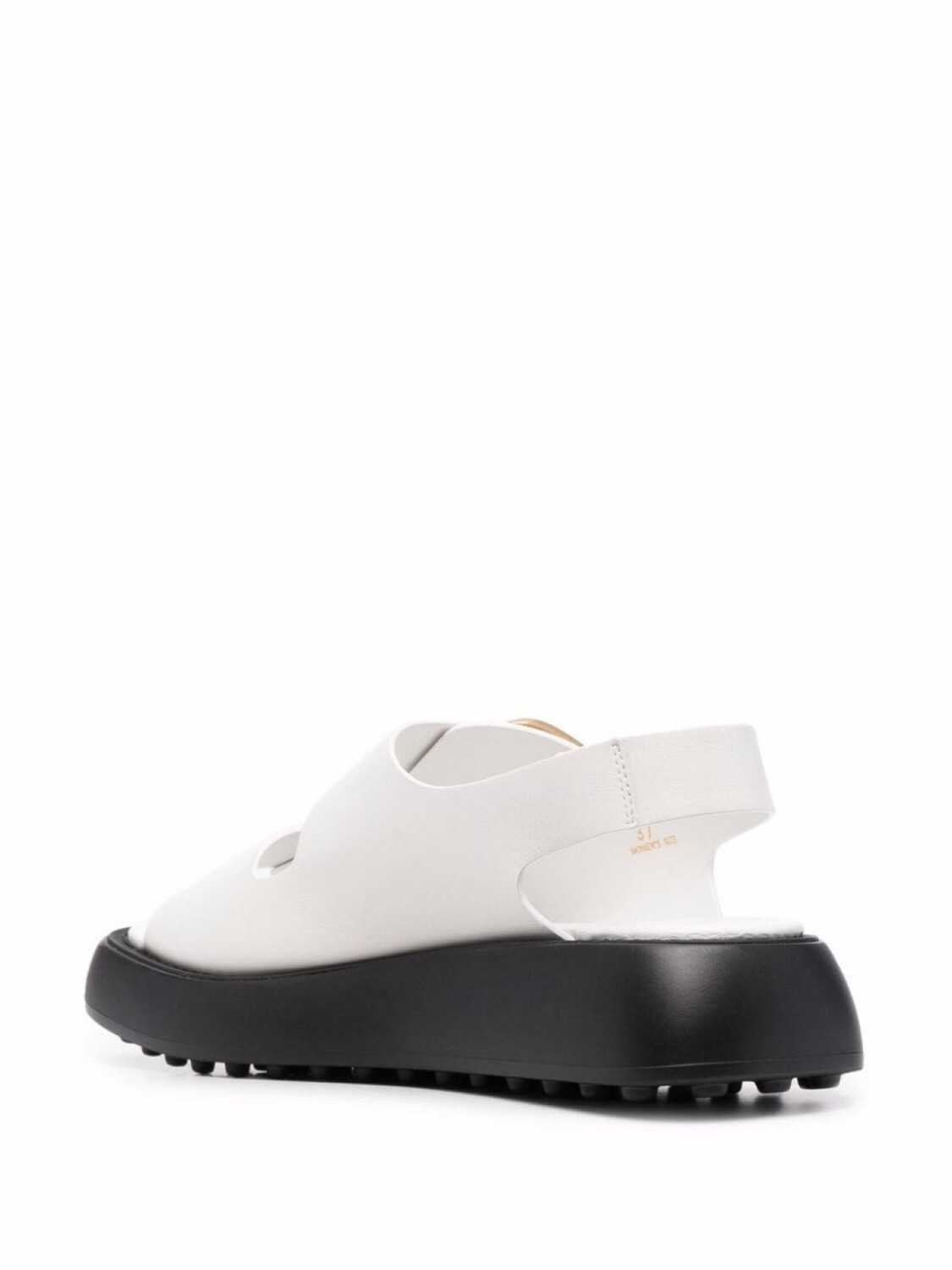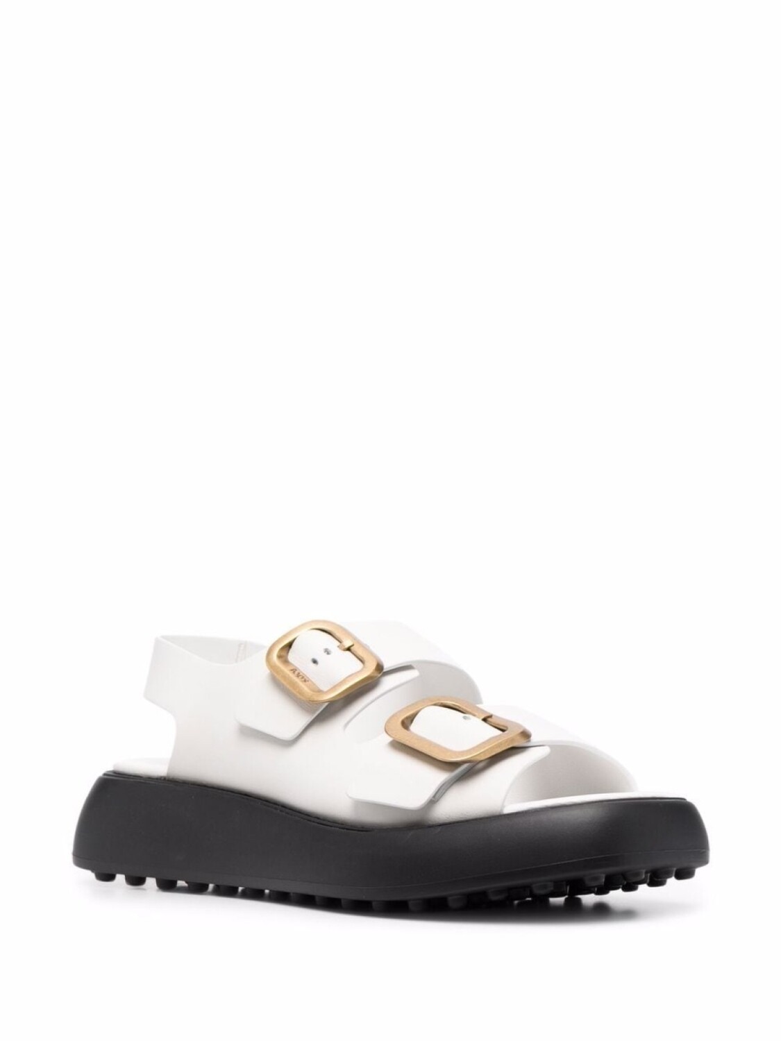 Выгравированный логотип, открытый носок, застежка с двумя пряжками, ремешок на пятке, мягкая стелька и подошва с заклепками.