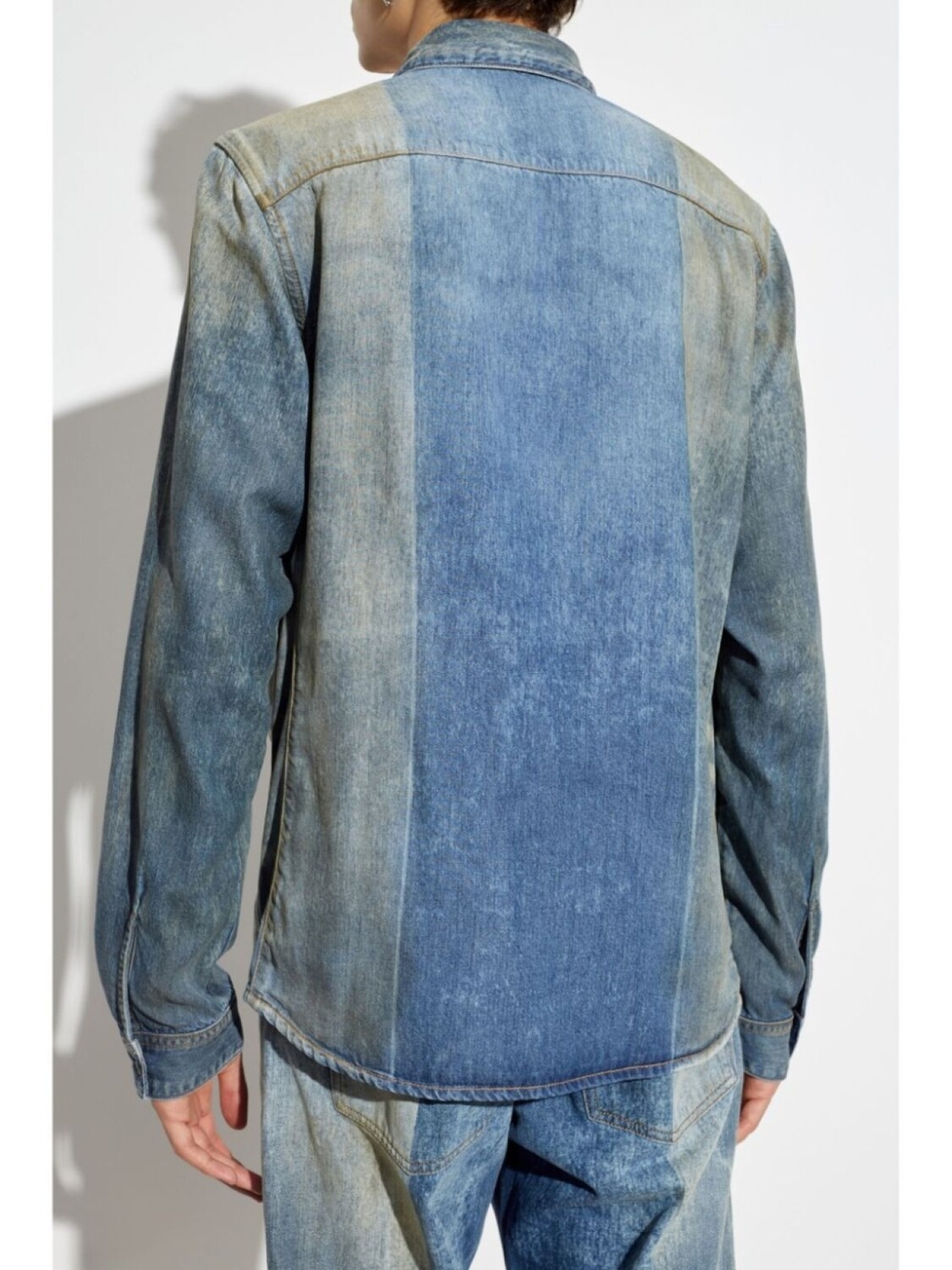 Синяя джинсовая ткань двухцветный дизайн застежка на пуговицы спереди эффект выцветания классический воротник вышитый логотип на груди длинные рукава манжеты на пуговицах