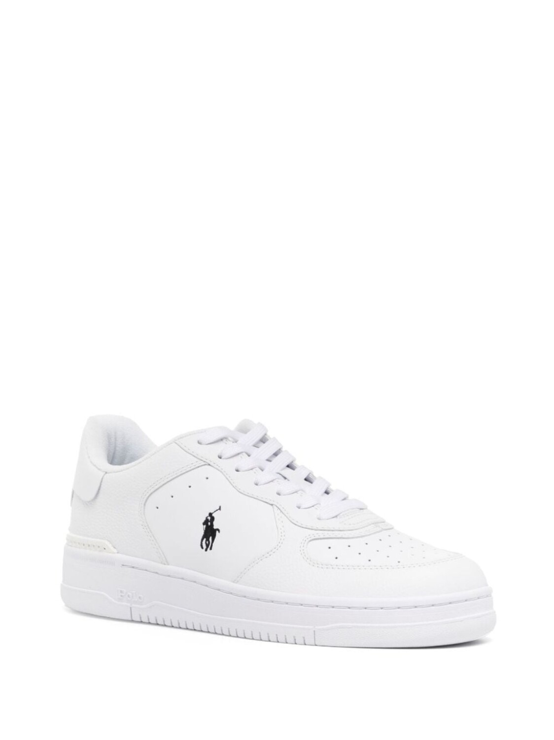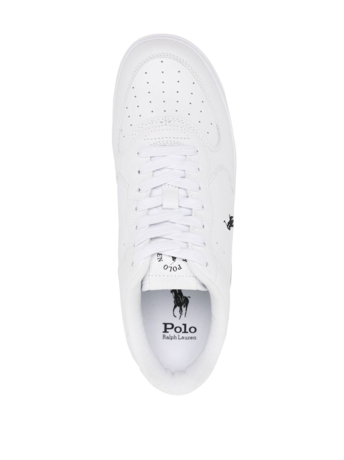 Белый, кожа, вышитый логотип сбоку, нашивка с логотипом на язычке, знаковый логотип Polo Pony, перфорированный носок, шнуровка спереди, задник с логотипом, стелька с логотипом, логотип на подошве и плоская резиновая подошва.