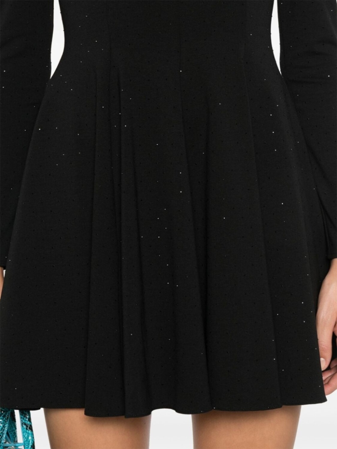 Черный, украшения из горного хрусталя, потайная застежка на молнии сзади, круглый вырез, длинные рукава, складки, приталенный силуэт, расклешенный подол, модель без подкладки