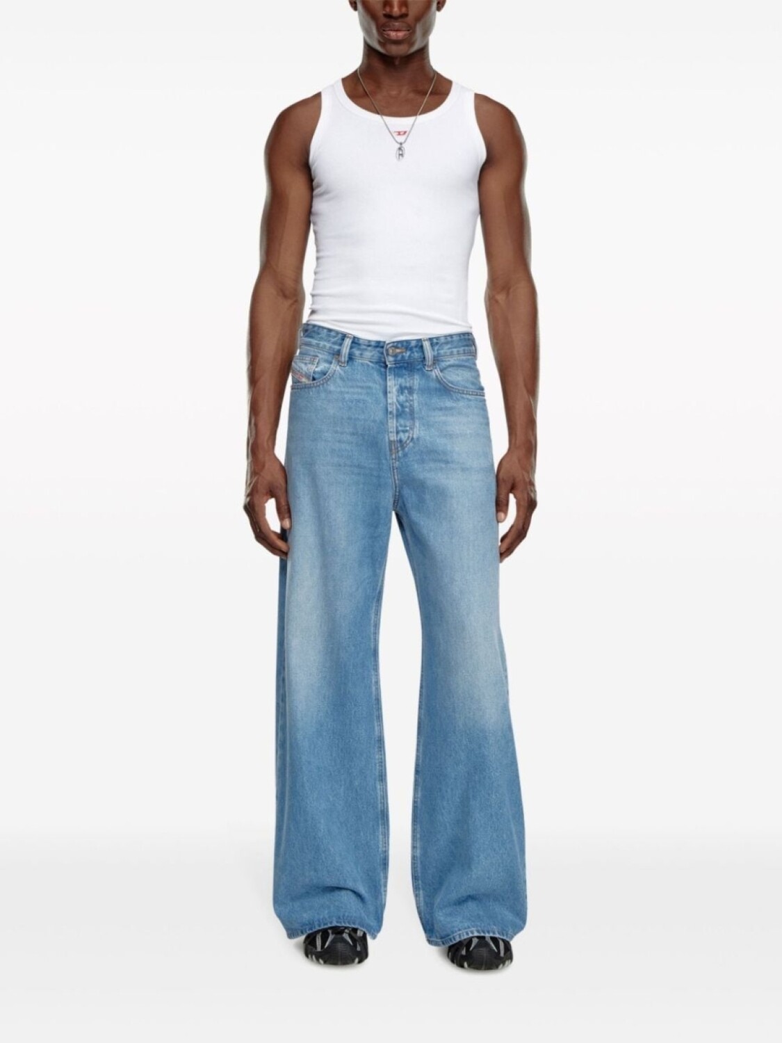 Подробнее о товаре: • индиго • хлопок • обработанный деним • эффект потертости • нашивка-логотип сбоку и сзади • низкая посадка • петли для ремня • свободный крой • потайная застежка на молнии и пуговицах • классическая пятикарманная модель • прямой подол • Это унисекс-модель. Обратите внимание, что для нее используется мужская размерная сетка. • Этот товар как минимум на 50% состоит из переработанных или повторно использованных материалов.