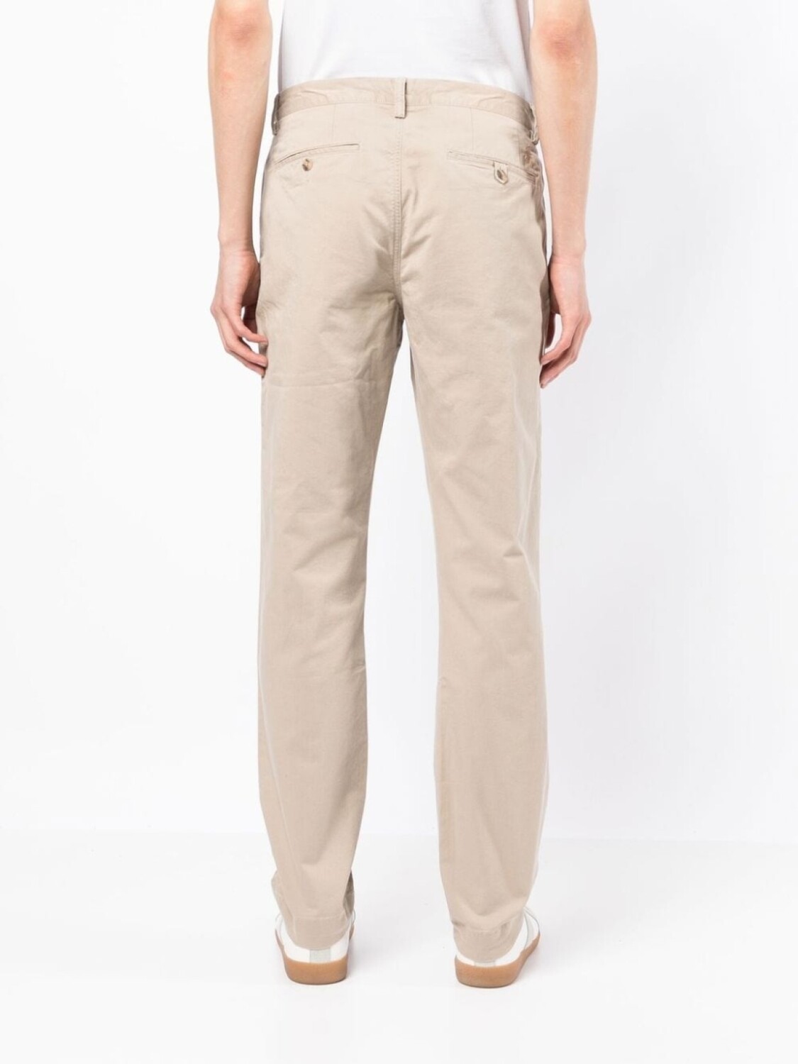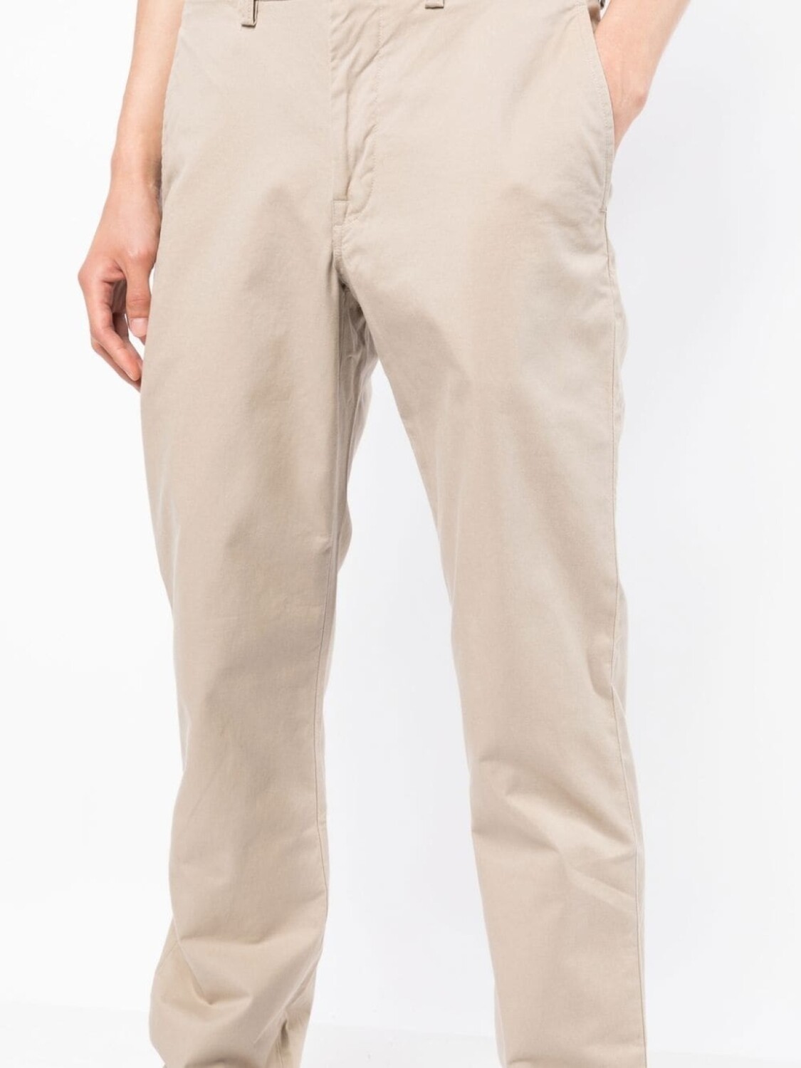 Светло-бежевый, смесовый хлопок, петли для ремня, застежка на молнии и пуговице спереди, два вшитых кармана по бокам, два кармана на пуговице сзади и прямой крой.