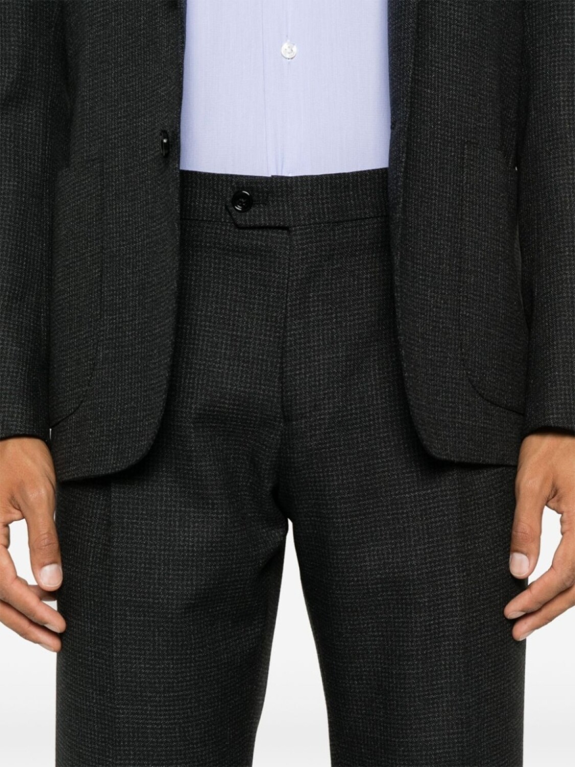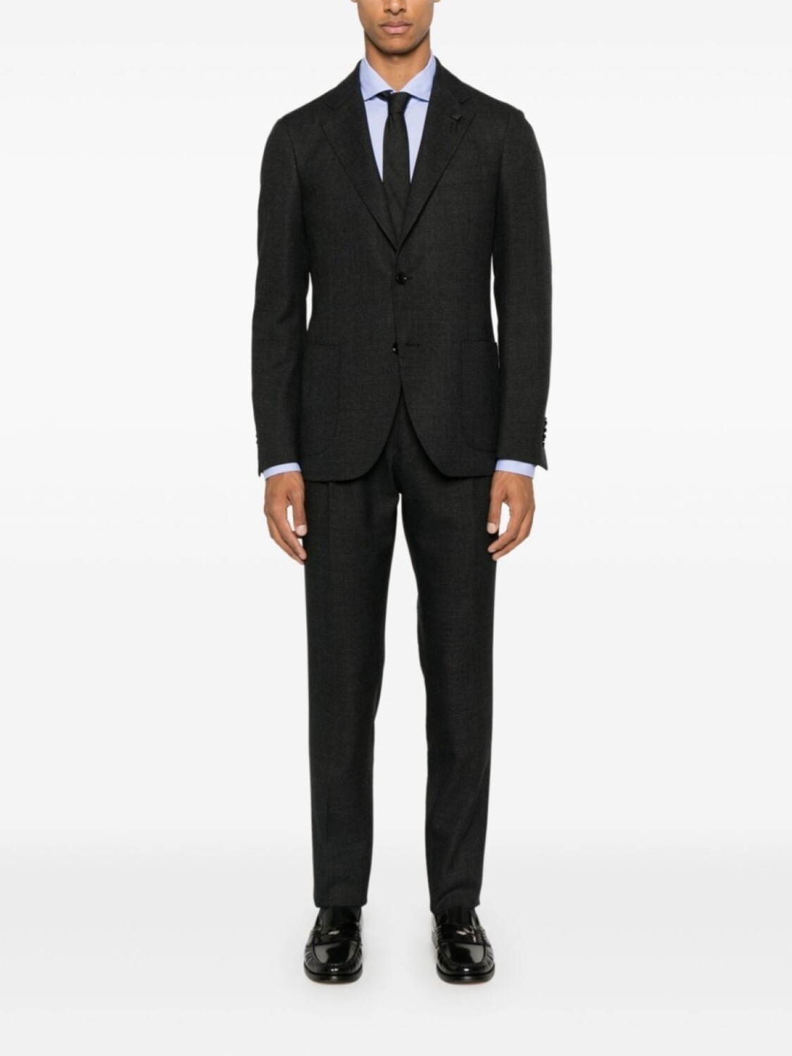Подробнее о товаре: • черный/серый • классический крой • застежка на пуговицах спереди • зазубренные лацканы • длинные рукава • манжеты на пуговицах • прорезной карман на груди • два передних кармана с клапанами • две боковые шлицы сзади • застежка на молнии и пуговице спереди • петли для ремня • складки • два вшитых кармана по бокам • два прорезных кармана на пуговицах сзади • прямой подол • прямой крой