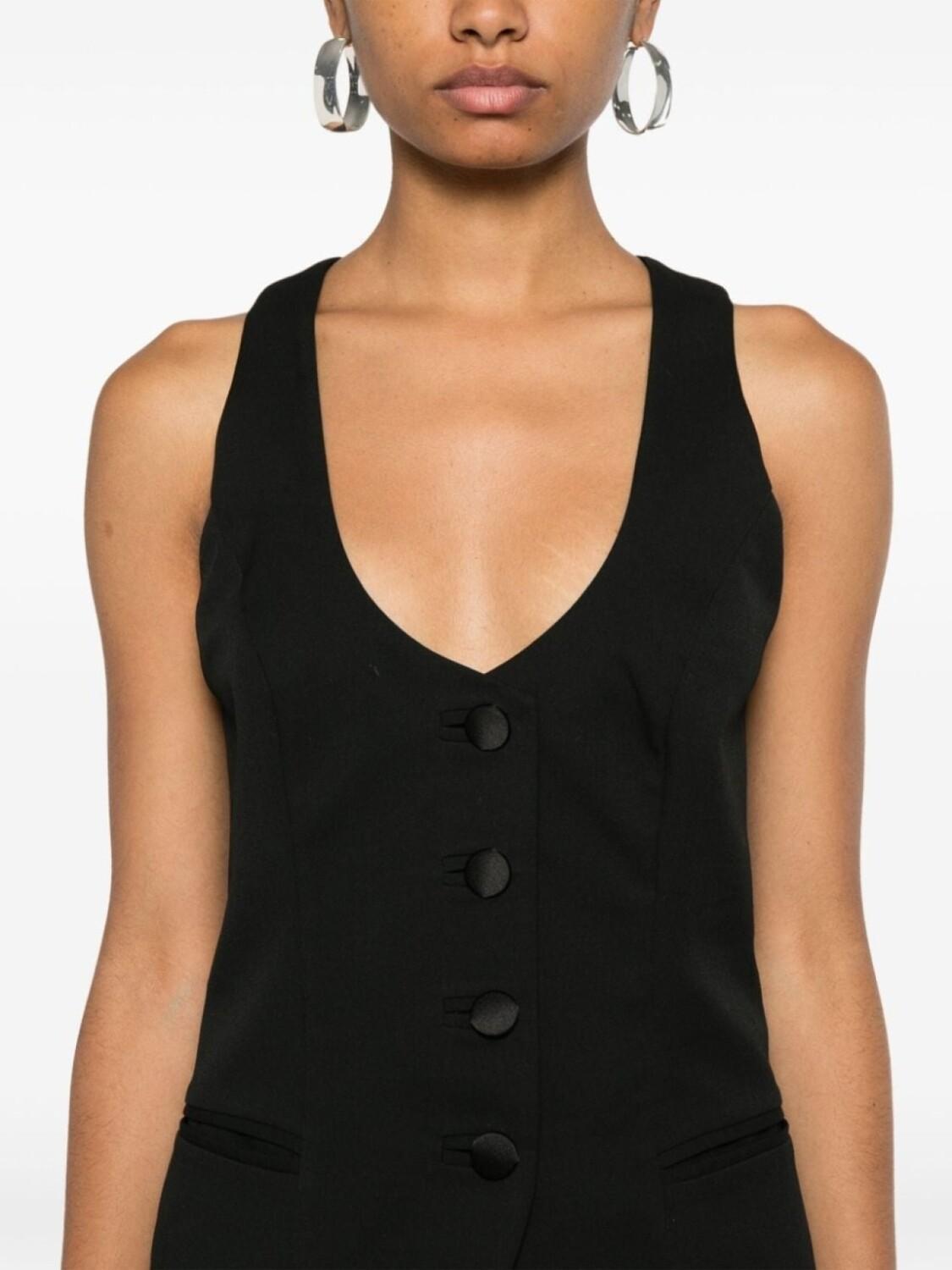 Черный, застежка на пуговицах спереди, глубокий V-образный вырез, без рукавов, защипы, два прорезных кармана спереди, цельная подкладка, закругленный подол