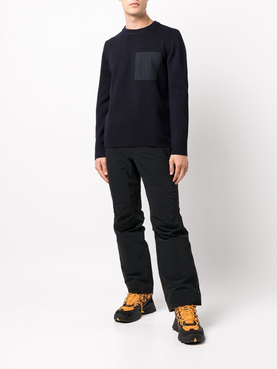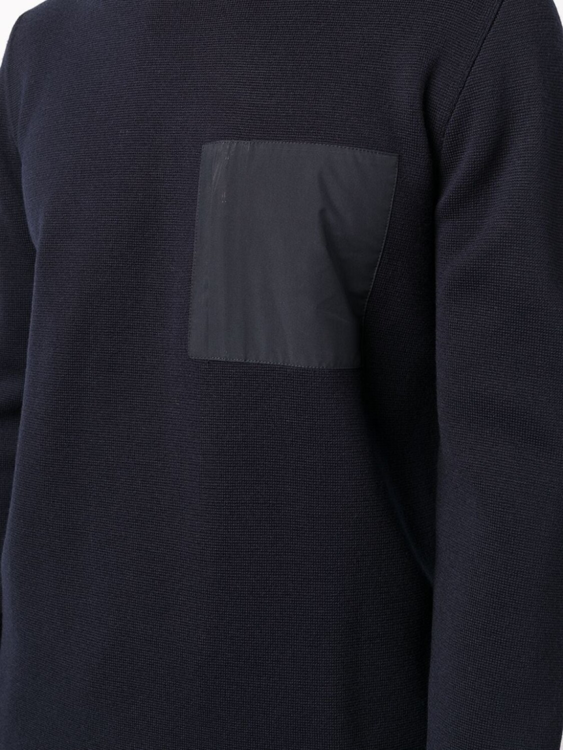 Два нагрудных кармана на молнии, круглый вырез, длинные рукава и прямой подол.