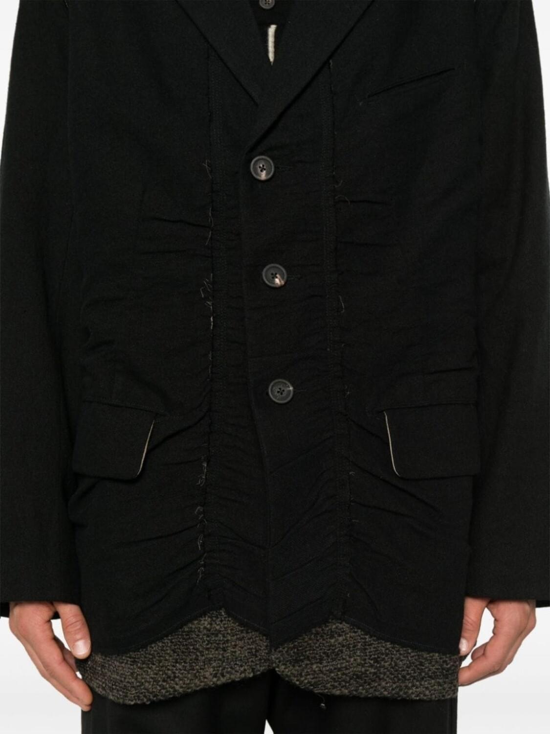 Подробнее о товаре: • черный • смесовая вирджинская шерсть • ткань с твиловым переплетением • застежка на пуговицах спереди • многослойная деталь • необработанные края • зазубренные лацканы • длинные рукава • манжеты на пуговицах • прорезной карман на груди • защипы • два передних кармана с клапанами • две боковые шлицы сзади • цельная подкладка • внутренний карман • прямой подол