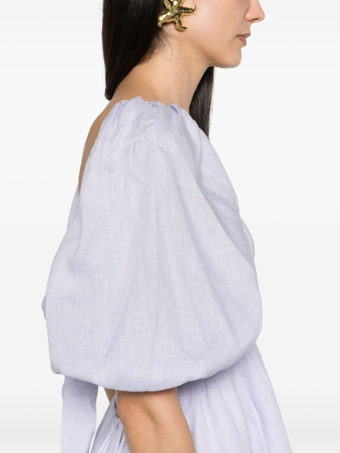 Лиловый, лен/флакс, края с фестонами, квадратный вырез, застежка на молнии и завязках сзади, открытая спина, пышные рукава три четверти, плиссированная юбка, подол с фкстонами, длина до бедер, Этот товар как минимум на 50% состоит из материалов, которые признаны более безопасными для окружающей среды, и/или произведены с использованием методов, которые помогают сократить потребление воды и химических веществ., Узнать больше о том, какие товары получают отметку «Ответственный выбор», можно здесь.