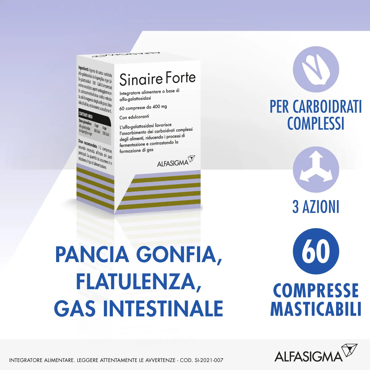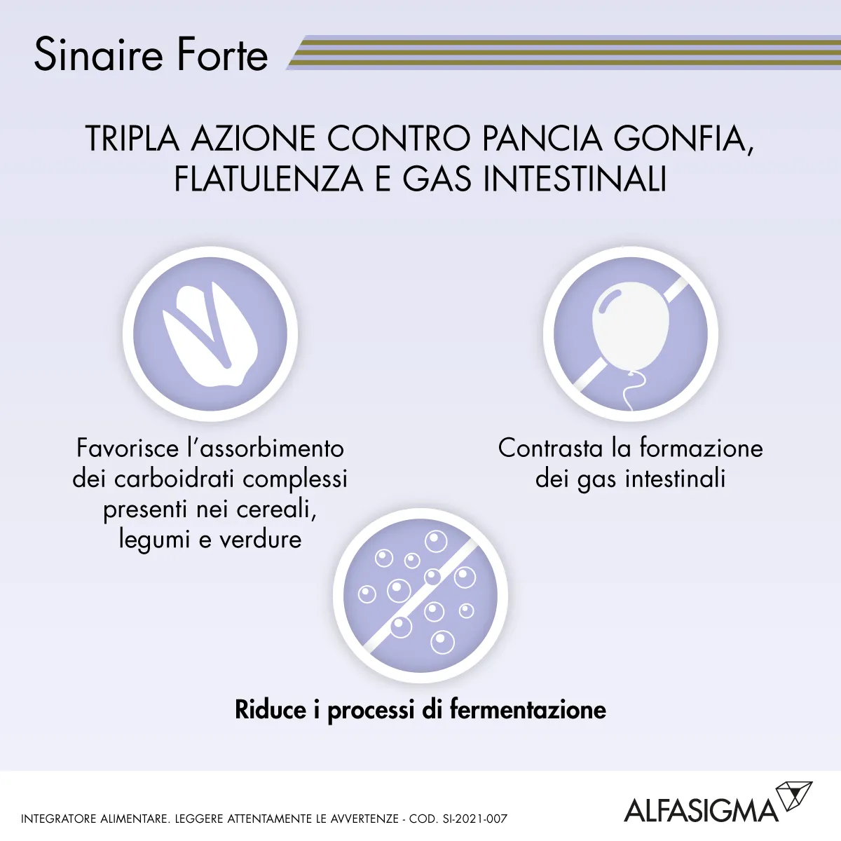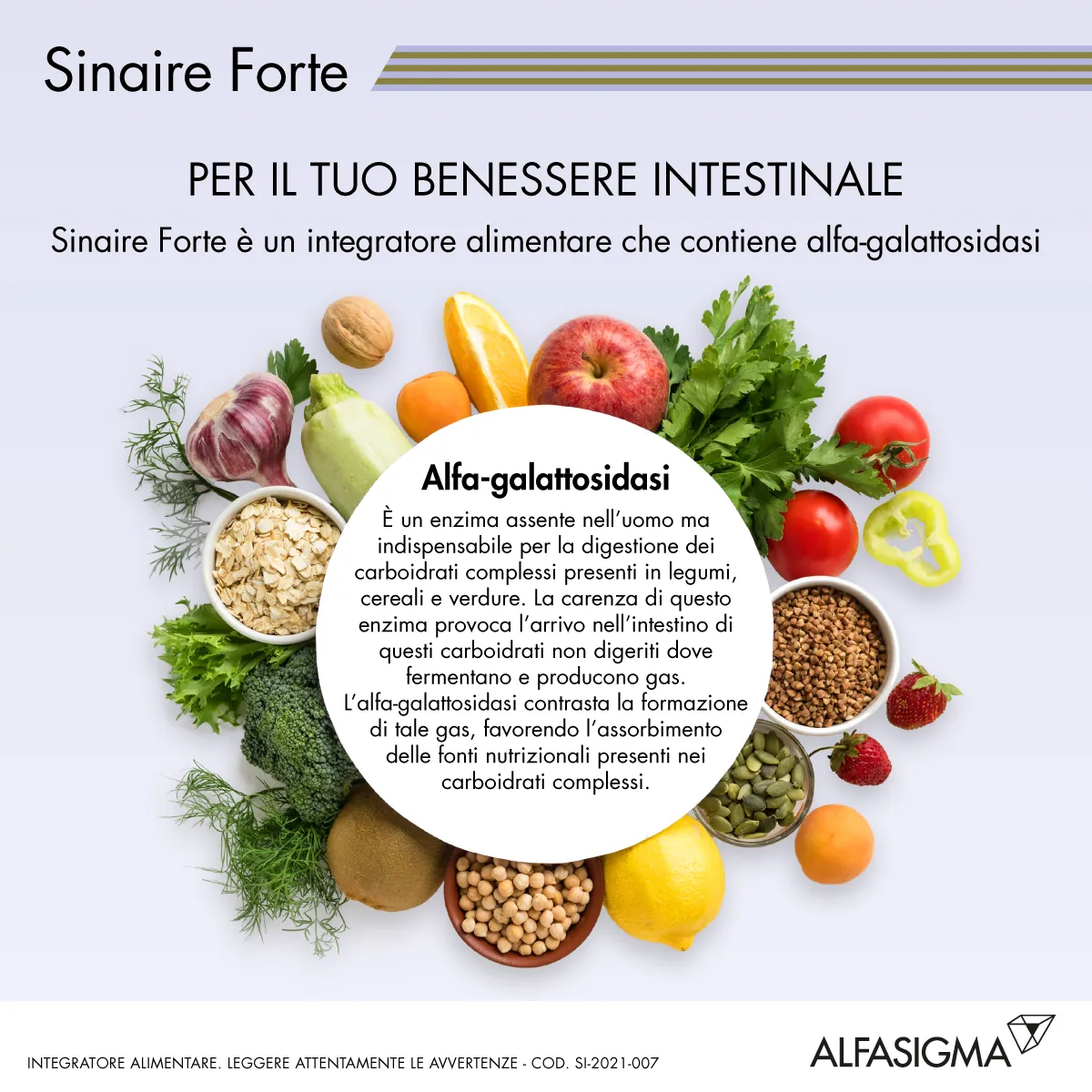 Sinaire Forte – пищевая добавка с альфа-галактозидазой, которая способствует усвоению сложных углеводов пищевых продуктов, снижая процессы брожения и противодействуя образованию газов.