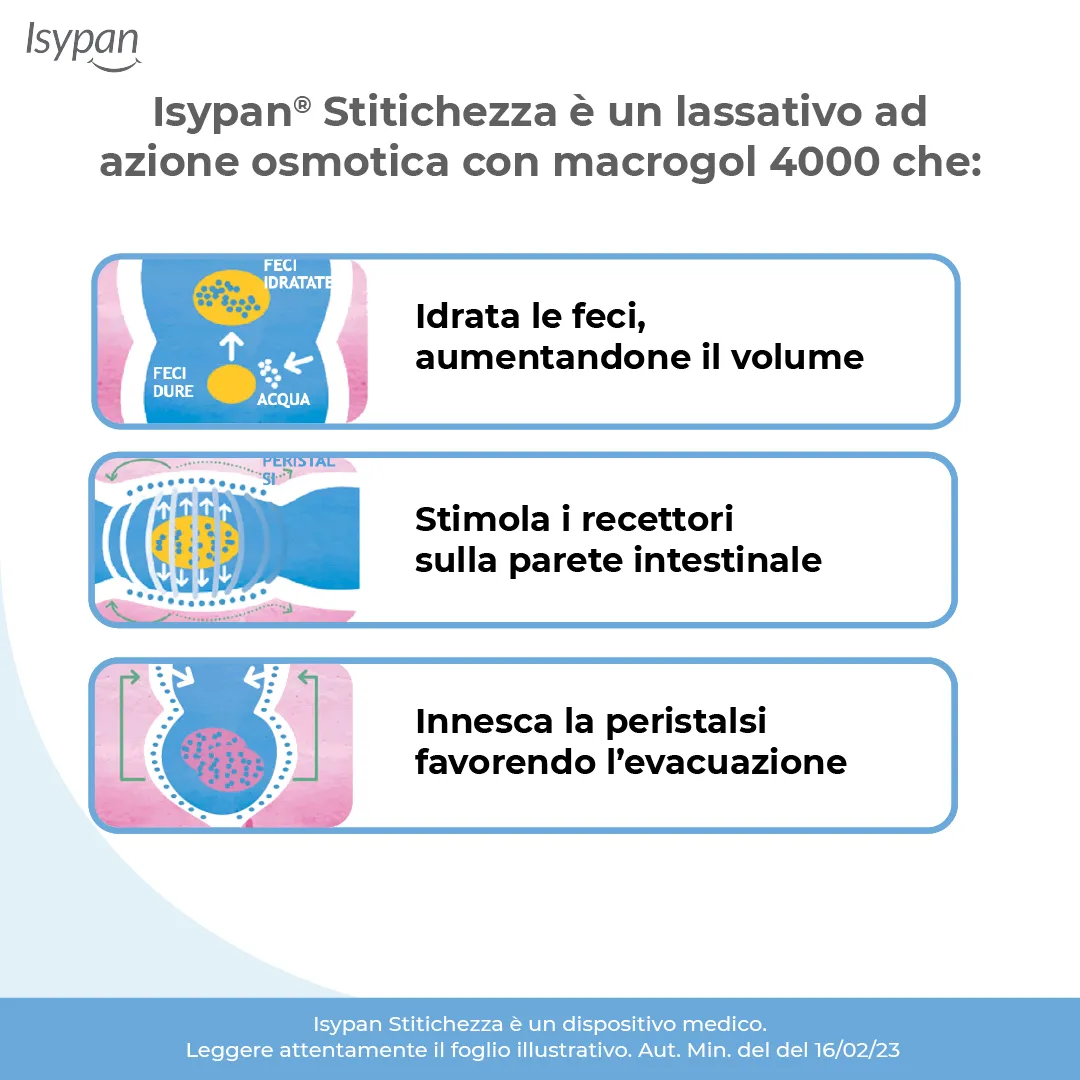 Хранить в недоступном для детей до двух лет возрасте. Его регулирующей функции способствуют здоровый образ жизни и правильное питание, богатое клетчаткой, фруктами и овощами, адекватное потребление жидкости и хорошая физическая активность. Не принимайте Исипан Запор при гиперчувствительности к макроголу 4000 и перфорации и/или непроходимости желудочно-кишечного тракта. В случае сомнений проконсультируйтесь с врачом или фармацевтом, прежде чем принимать Исипан. Как и при применении всех слабительных средств, перед началом лечения необходимо исключить наличие органических нарушений. Исипан Запор можно принимать в течение длительного времени, но если симптомы сохраняются, несмотря на соответствующие диетические меры, необходима консультация врача для исключения основных патологий. Адекватных и хорошо контролируемых исследований не проводилось, поэтому не принимайте Исипан Запор во время беременности и/или кормления грудью. Не принимать одновременно с пероральными препаратами. Чрезмерные дозы Исипана. Запор может вызвать диарею, боль в животе, вздутие живота и рвоту, которые проходят при прекращении лечения или уменьшении дозы. В этих обстоятельствах вам следует обратиться к врачу. Не принимайте двойную дозу Исипана Запор, чтобы компенсировать пропущенную дозу. Возможные побочные эффекты, наблюдаемые у взрослых и детей: диарея, боль в животе, вздутие живота, тошнота, рвота, недержание кала и метеоризм. Редкие случаи аллергических реакций. В этом случае прекратите использование продукта и сообщите об этом своему врачу или фармацевту. В случае диареи, которая обычно исчезает при прекращении лечения или уменьшении дозы, рекомендуется обратиться к врачу. Если какой-либо из побочных эффектов станет серьезным или вы заметите появление каких-либо побочных эффектов, не перечисленных в данной брошюре, сообщите об этом своему врачу или фармацевту. Перед использованием продукта во время беременности или кормления грудью желательно проконсультироваться с врачом.