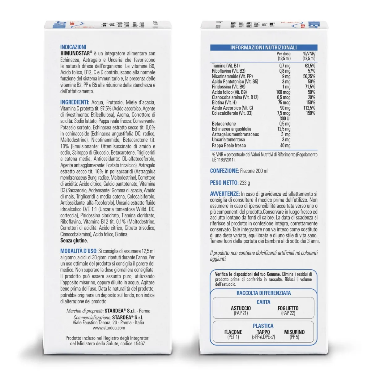 Витамин С или аскорбиновая кислота — это витамин, входящий в состав водорастворимых молекул, который легко разлагается под действием света и высоких температур (никогда не нагревать). или приготовление травяных чаев). По этой причине, если мы хотим выпить сок, мы должны выпить его немедленно, чтобы избежать окисления аскорбиновой кислоты и, следовательно, потери полезных эффектов. Сколько витамина С следует потреблять каждый день? Суточная норма витамина С должна быть равна 60/90 мг в день, но для тех, кто выкуривает более 10 сигарет в день, она должна достигать минимум 140 мг в день. Но что произойдет, если мы превысим дозу витамина С? Чрезмерное потребление витамина С может быть вызвано несбалансированным питанием, но прежде всего злоупотреблением пищевыми добавками, содержащими этот витамин. Избыток может вызвать проблемы с почками, образование камней или передозировку железа, поскольку витамин С способствует всасыванию в кишечнике. Кроме того, чрезмерное потребление витамина С может вызвать головные боли, гастрит, рвоту, диарею и спазмы в животе, а также головокружение и приливы жара. целлюлоза), ароматизатор, регулятор кислотности: лактат натрия, свежее маточное молочко. Консервант: сорбат калия, сухой экстракт эхинацеи, титрованный до 0,6% эхинакозида (корень Echinacea angustifolia DC., мальтодекстрин), никотинамид, бета-каротин, титрованный до 10% (соевый белок, сироп глюкозы, бета-каротин. Антиоксиданты: DL-αтокоферол, Аскорбилпальмитат: трикальцийфосфат), сухой экстракт астрагала, титрованный до 16% полисахаридов (корень астрагала мембранцеуса Мёнха, мальтодекстрин), пантотенат кальция, водно-спиртовой жидкий экстракт ункарии D/E 1:1 (Uncaria tomentosa Willd. DC. bark). ), пиридоксина гидрохлорид, рибофлавин, тиамина гидрохлорид, витамин B12, титрованный до 0,1% (мальтодекстрин, регуляторы кислотности: лимонная кислота, тринатрийцитрат, цианокобаламин), фолиевая кислота, биотин. Регулятор кислотности: Лимонная кислота. Продукт не содержит искусственных подсластителей и красителей. Рекомендуется принимать по 12,5 мл в день циклами по 30 дней, повторяемыми в течение года. Для оптимального использования продукта рекомендуем проконсультироваться с врачом. Не превышайте рекомендуемую суточную дозу. Продукт можно принимать в чистом виде, используя соответствующую мерную чашку, или разбавлять водой. Перед использованием хорошо взболтайте. Учитывая натуральность продукта, на дне может образоваться налет, что не является признаком переделки продукта. .