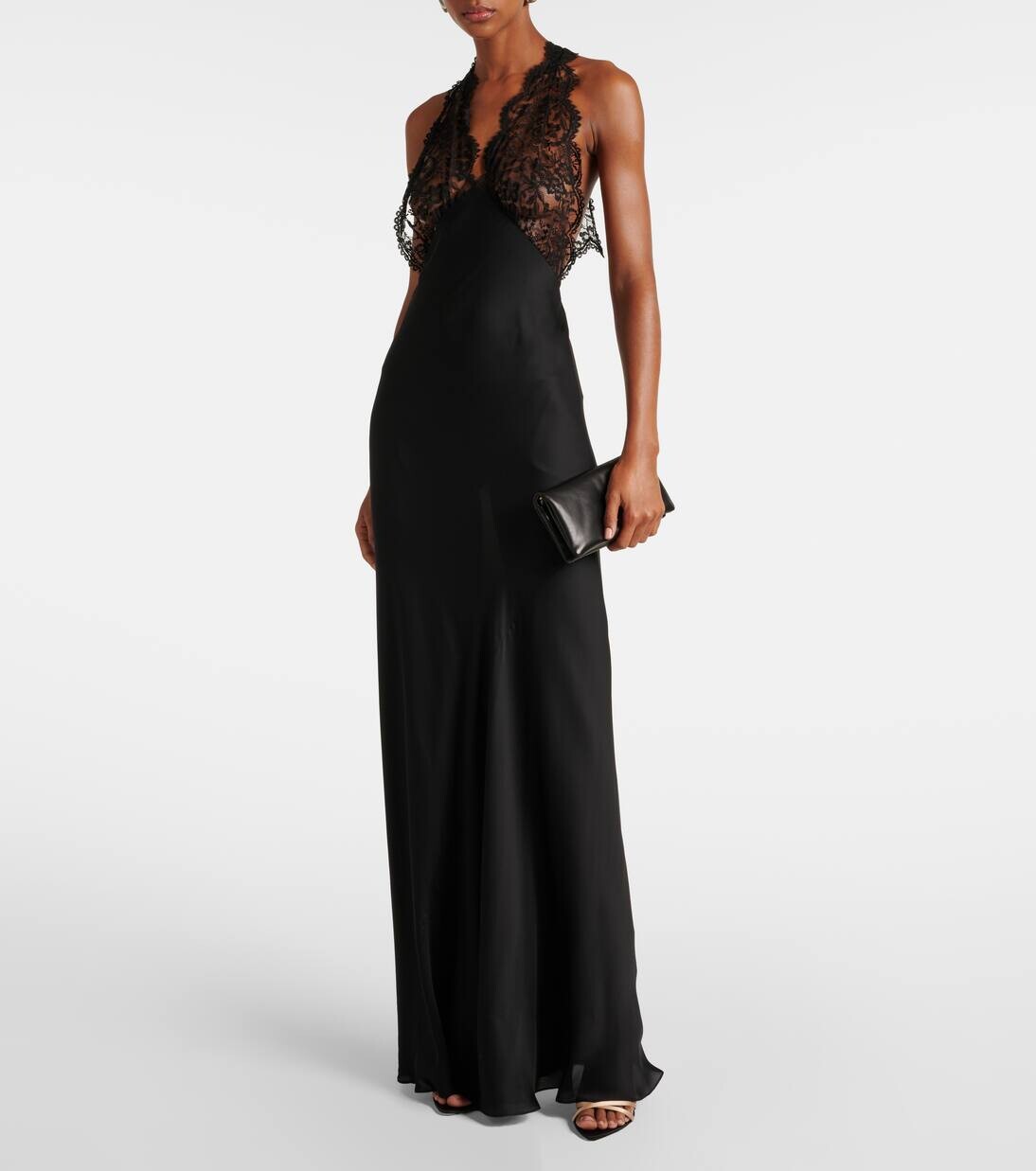 Платье из шелкового шармеза с кружевной отделкой Saint Laurent, черный