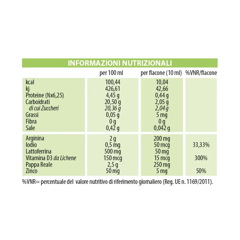 Содержимое мерного колпачка: аспартат аргинина; наполнитель: карбоксиметилцеллюлоза; антислеживатель: диоксид кремния; пантотенат кальция, рибофлавин, тиамина гидрохлорид, пиридоксина гидрохлорид, цианокобаламин тит. 0,1% (цианокобаламин, мальтодекстрин; подкислители: лимонная кислота, тринатрийцитрат), эргокальциферол. Содержимое флакона: вода, фруктоза, акациевый мед, свежее маточное молочко, лактоферрин, элеутерококк (Eleutherococcus centicosus (Rupr. et Maxim) Maxim), экстракт корневой жидкости E/D 1:1 (элеутерококк, этанол, вода), аспартат аргинина; регулятор кислотности: раствор лактата натрия. 60%; апельсиновый аромат; консервант: сорбат калия; регулятор кислотности: лимонная кислота. Без глютена. Мы рекомендуем принимать по 1 флакону в день. Чтобы взять содержимое флакона: поверните крышку по часовой стрелке до упора, чтобы порошок, содержащийся в капсуле, попал во флакон; встряхнуть; отвинтите крышку и сразу же примите содержимое внутрь.