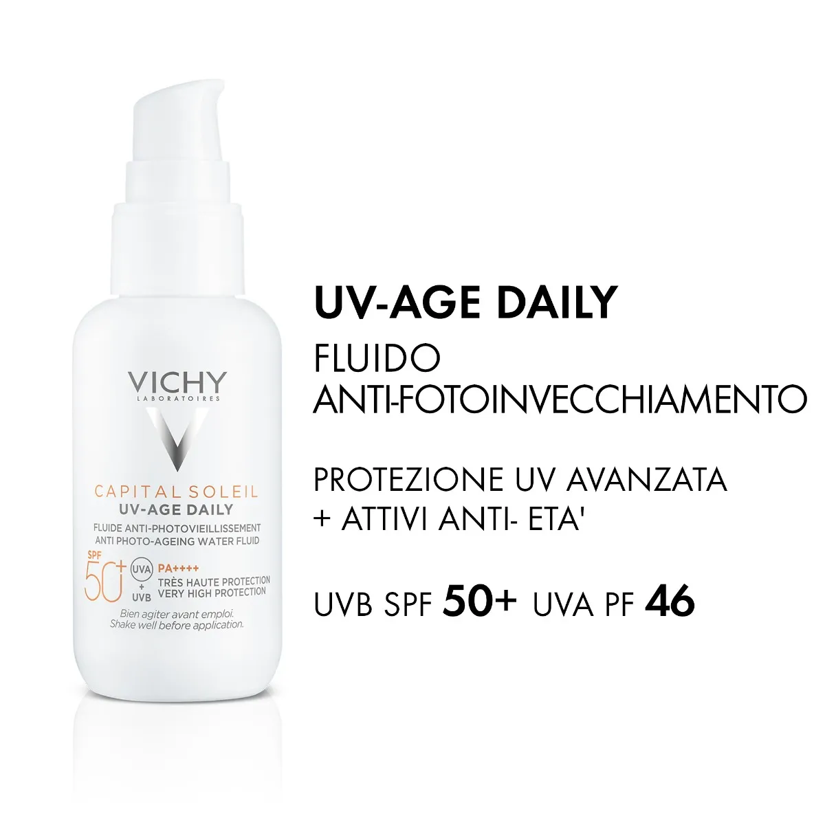 UV-AGE DAILY — корректирующий флюид для ежедневного использования, который корректирует морщины и темные пятна, а также предотвращает фотостарение. Обогащенный высокоэффективными антивозрастными активными ингредиентами и благодаря инновационной системе фильтров NETLOCK TECHNOLOGY, он инкапсулирует УФ-фильтры в микрокристаллы, создавая более однородную и компактную пленку для более высокой защиты от ультрафиолета.