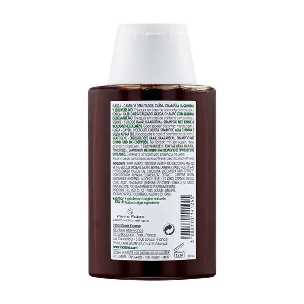 Klorane Fortifying Shampoo Quinine Edelweiss 100 мл — шампунь против выпадения волос, разработанный для слабой кожи головы и волос. Очищает, стимулирует и укрепляет волосы всех типов благодаря формуле, обогащенной витаминами группы В, экстрактами хинного дерева и ОРГАНИЧЕСКИМ Эдельвейсом. Жидкая, приятная текстура, легко смывается, имеет легкий пенящийся эффект. Древесный аромат. Подходит для мужской и женской кожи головы и волос, предназначен для ежедневного использования. Его можно использовать для чувствительной кожи головы.