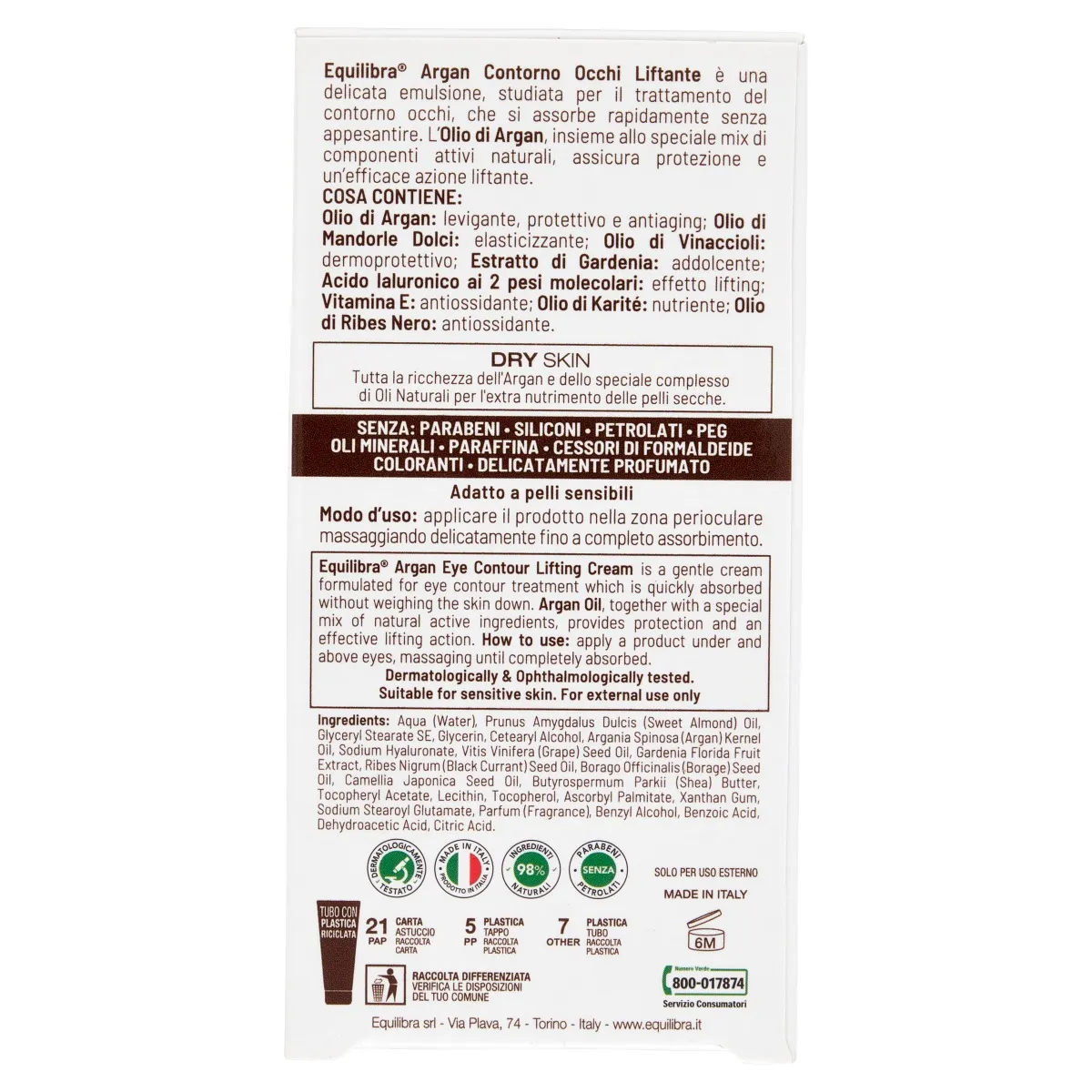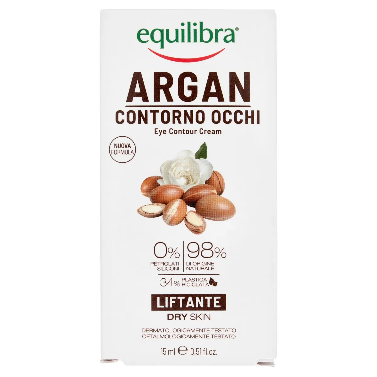 Equilibra Argan Eye Contour — эмульсия, предназначенная для уход за контуром глаз, который благодаря наличию арганового масла в сочетании со специальной смесью натуральных активных компонентов обеспечивает защиту и эффективный лифтинг.